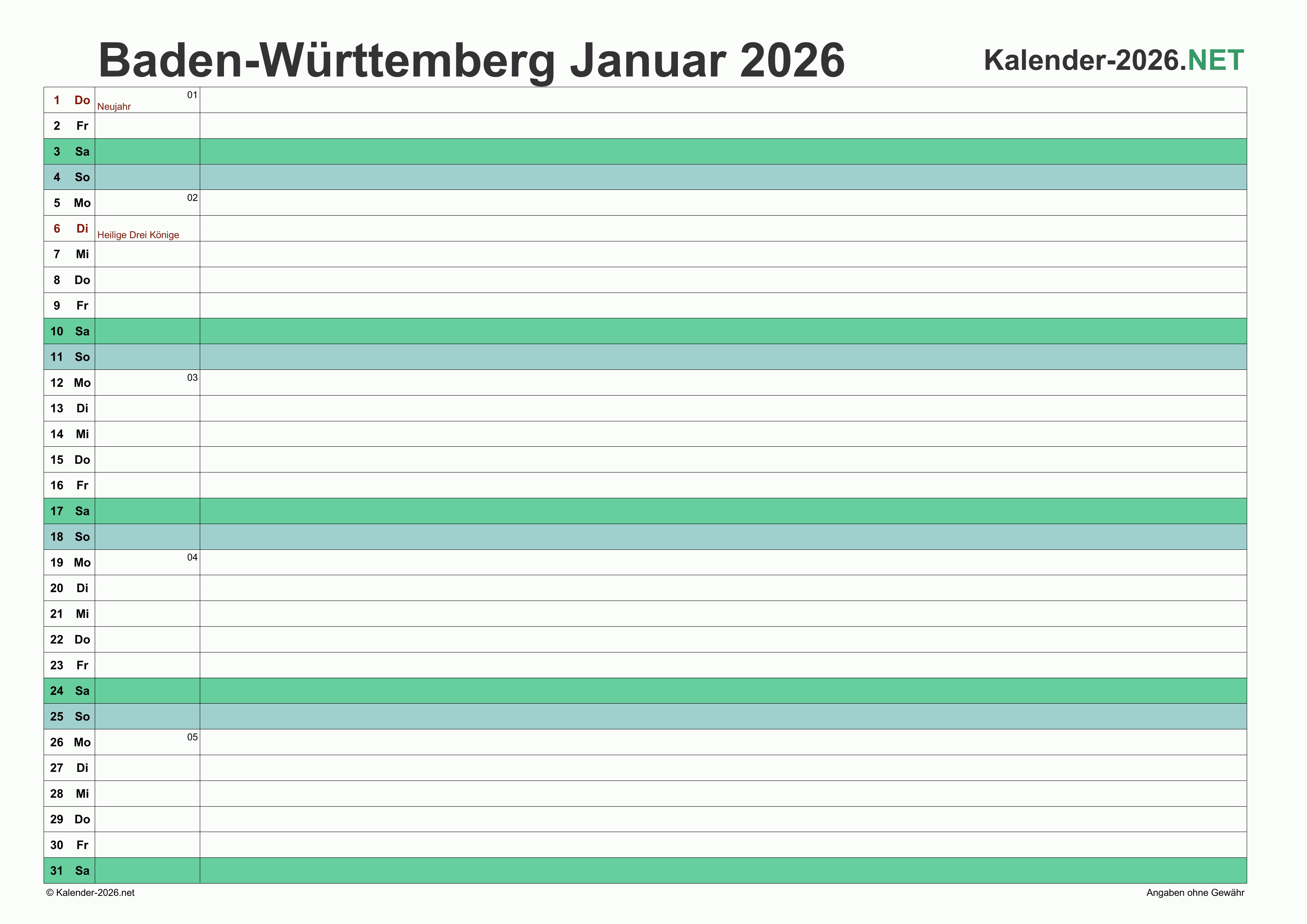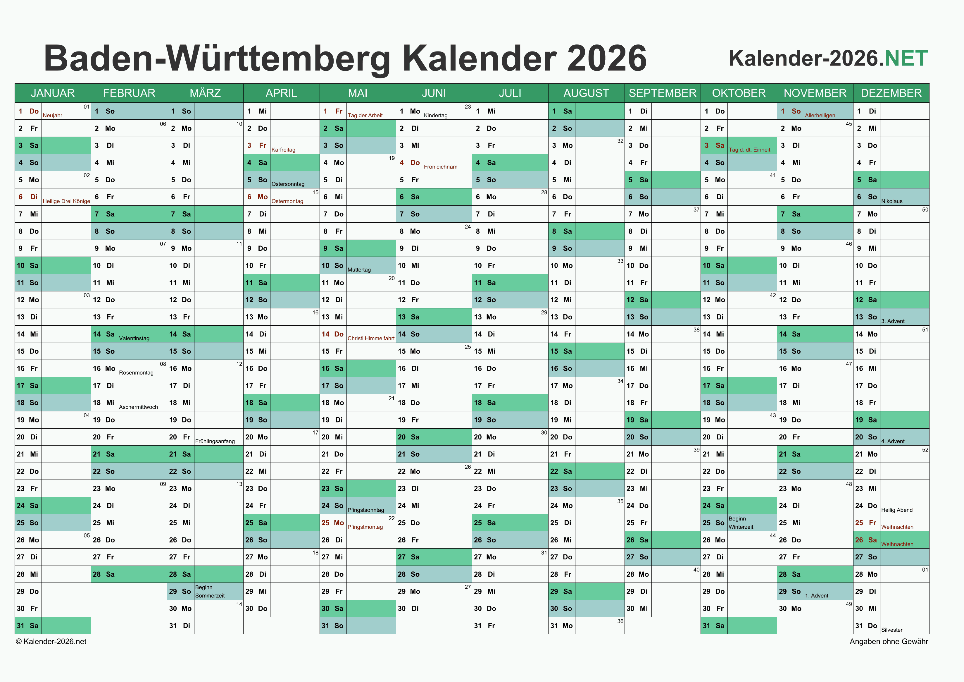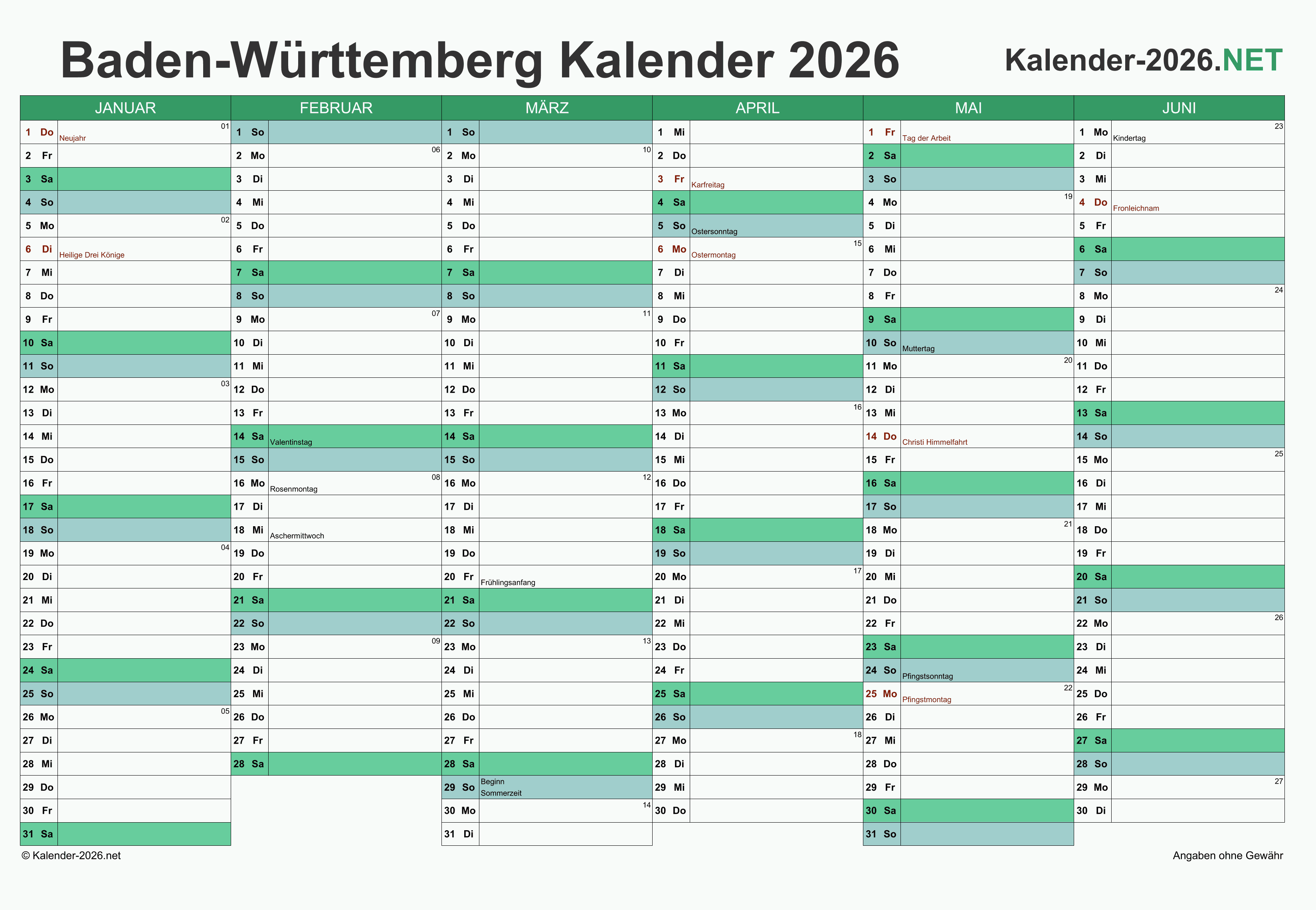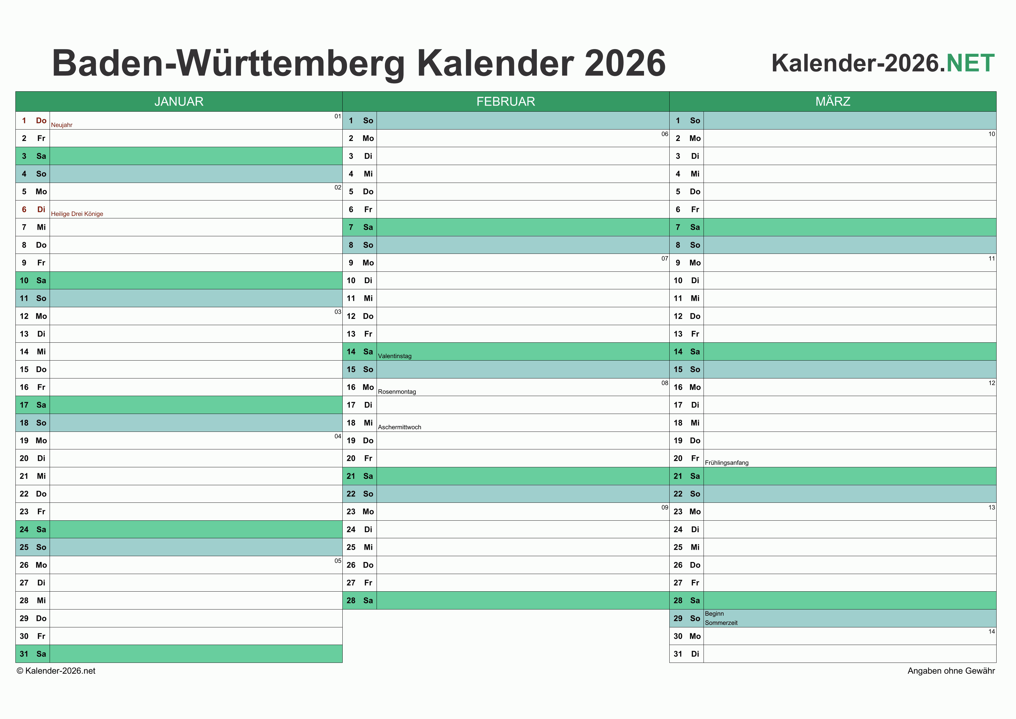 Hier finden Sie kostenlose Kalender 2026 für Baden-Württemberg mit gesetzlichen Feiertagen und Kalenderwochen. Diese Kalendervorlagen im DIN A4-Querformat können ideal als Jahres- und Terminplaner, Notizkalender, Bürokalender, Arbeitskalender, Urlaubsplaner oder Familienkalender verwendet werden.