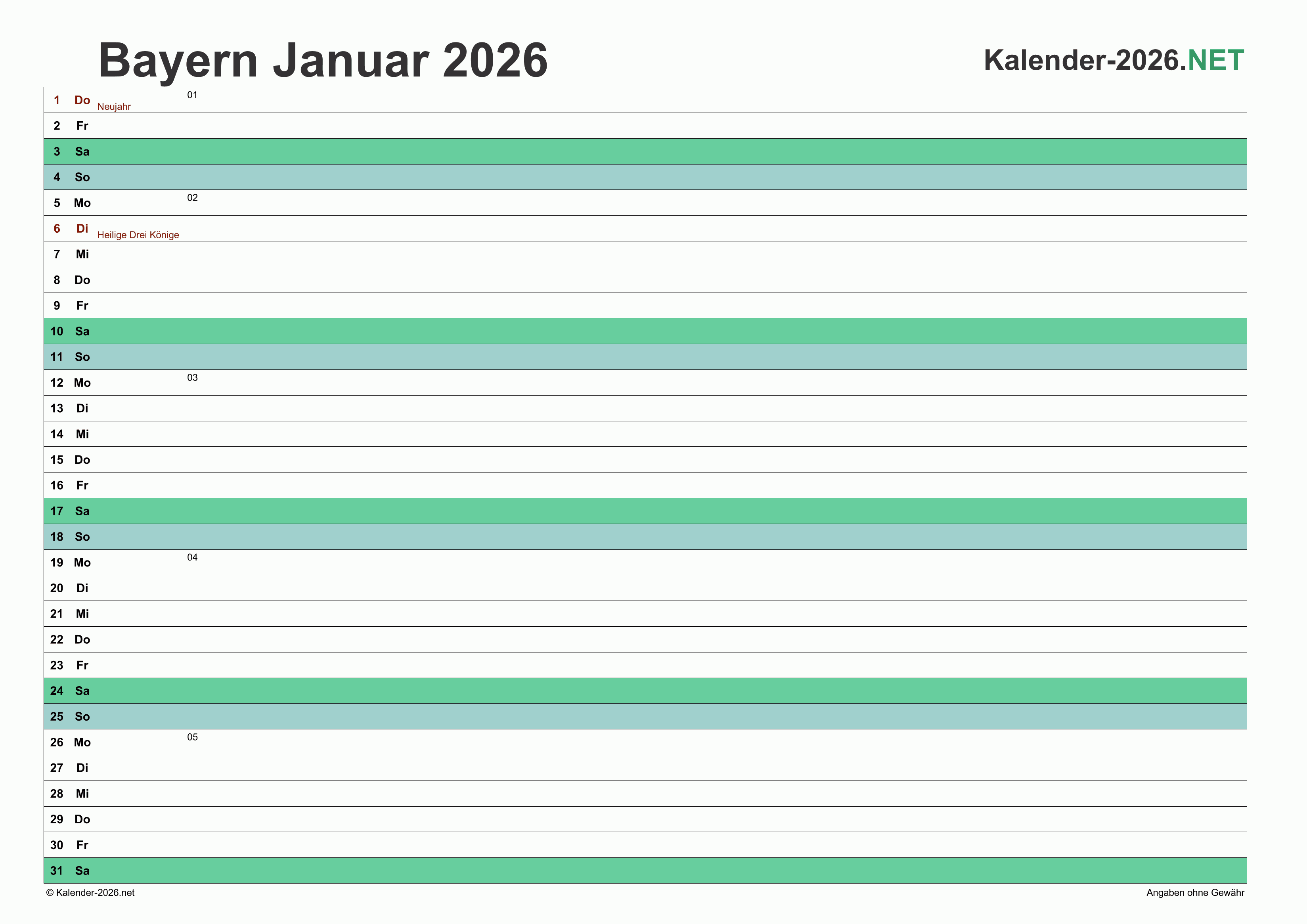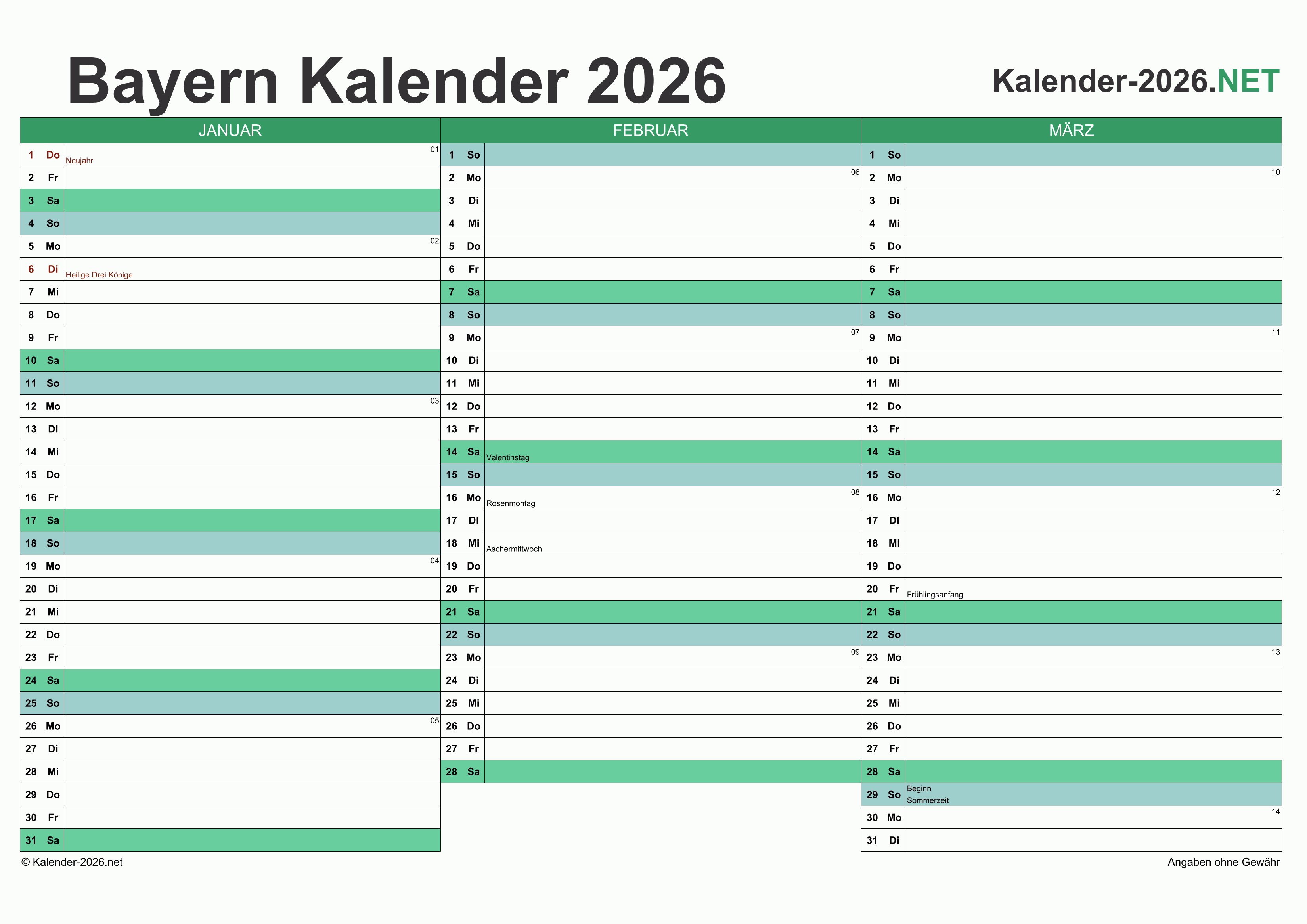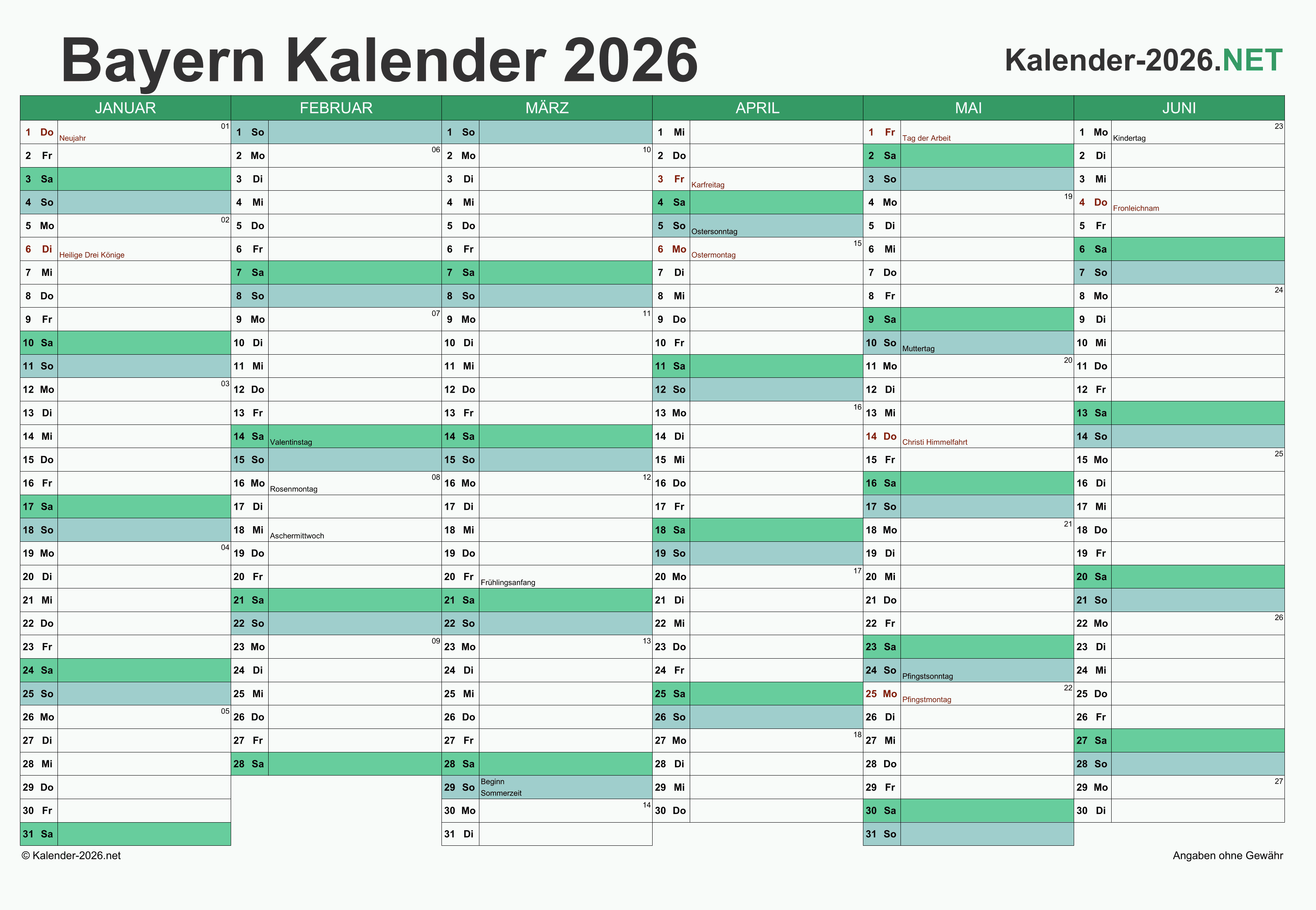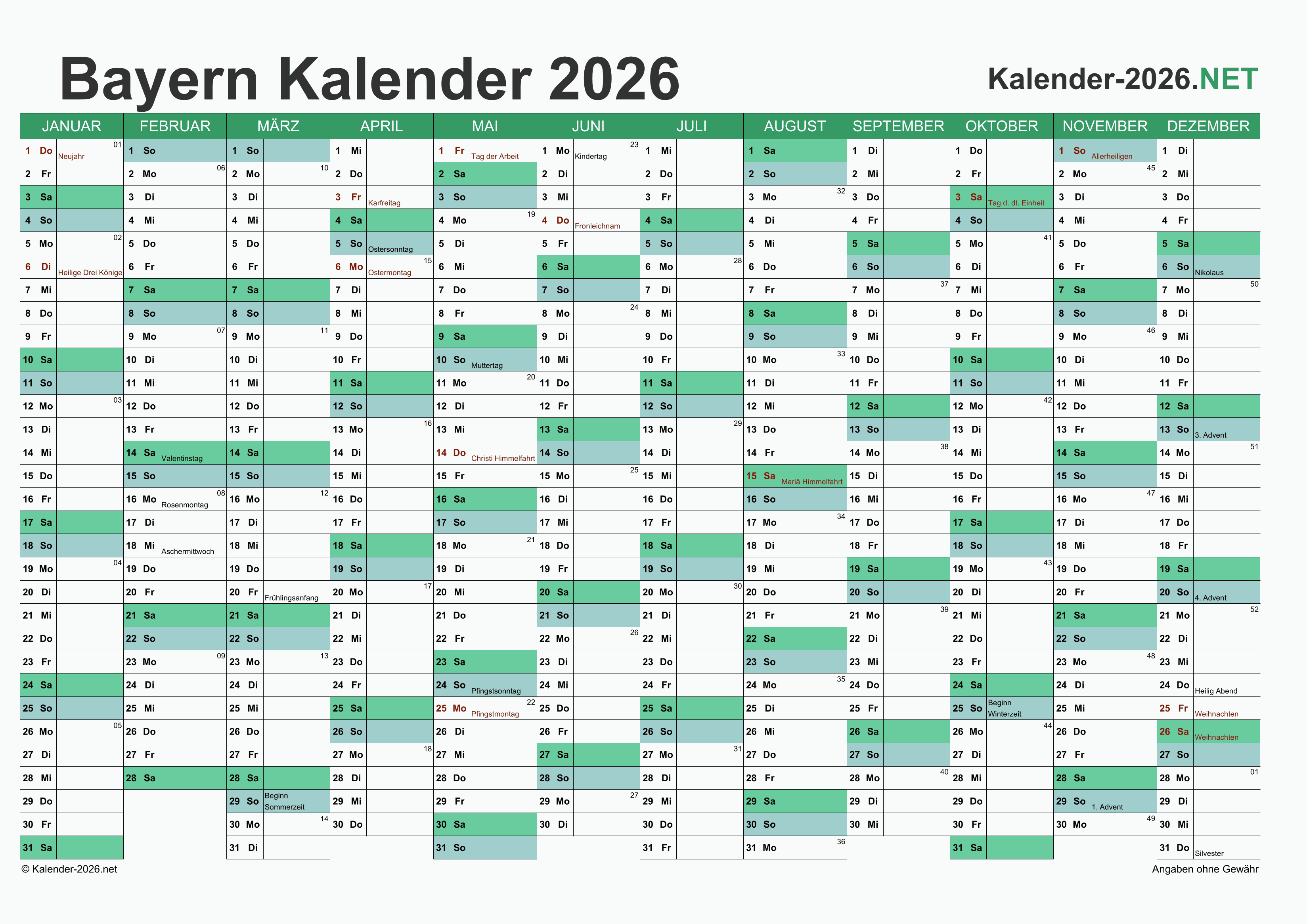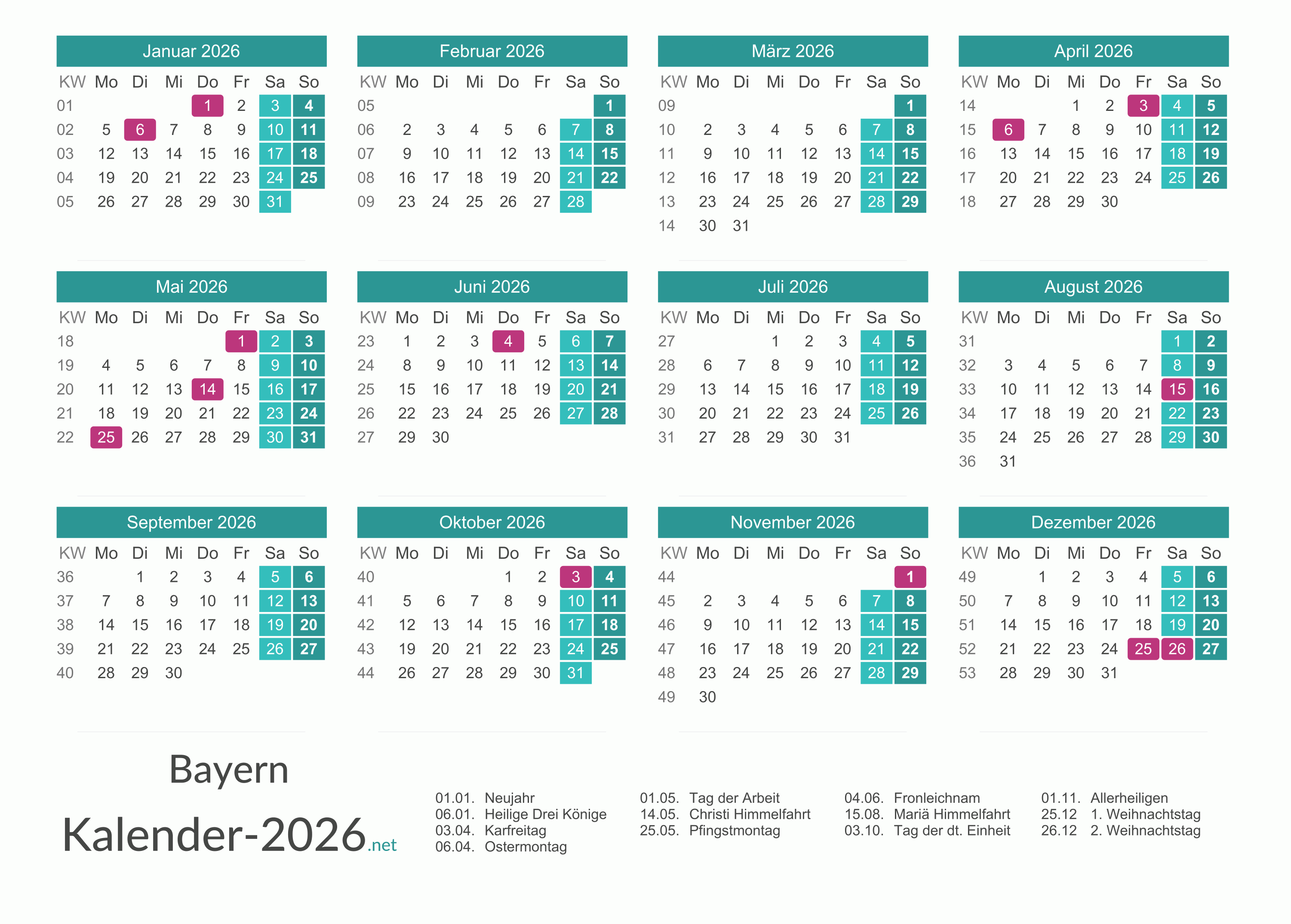 Hier finden Sie kostenlose Kalender 2026 für Bayern mit gesetzlichen Feiertagen und Kalenderwochen. Diese Kalendervorlagen im DIN A4-Querformat können ideal als Jahres- und Terminplaner, Notizkalender, Bürokalender, Arbeitskalender, Urlaubsplaner oder Familienkalender verwendet werden.