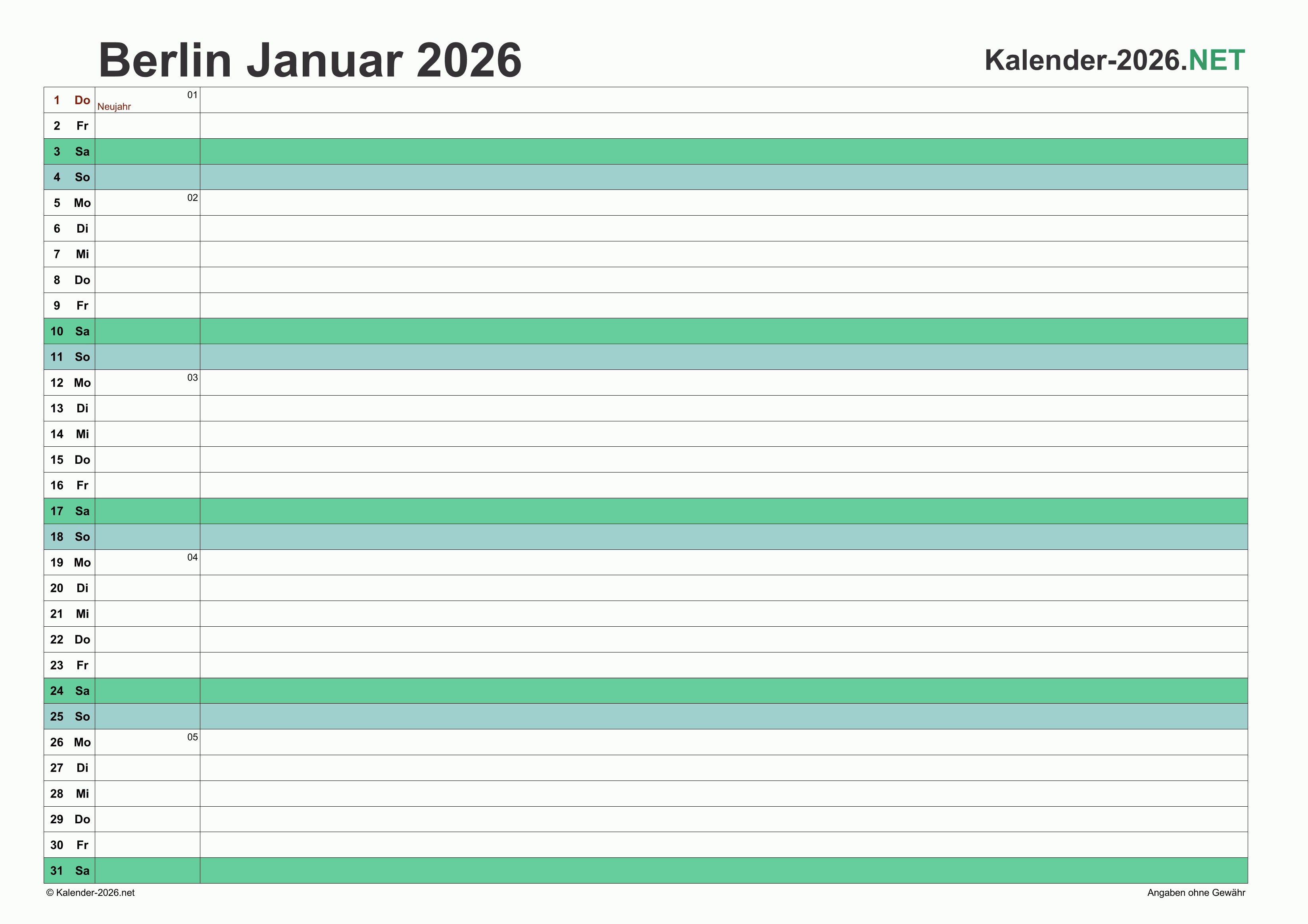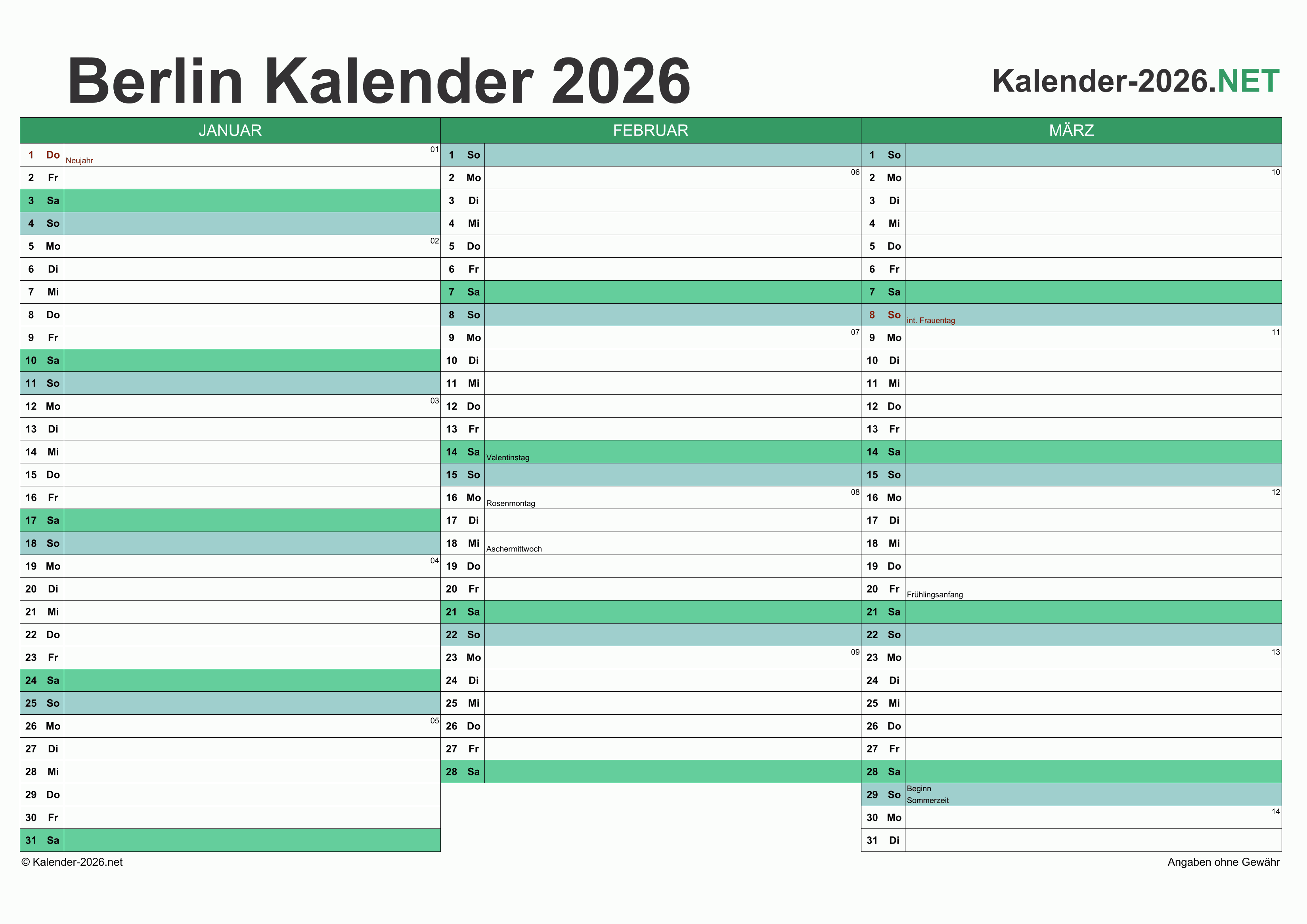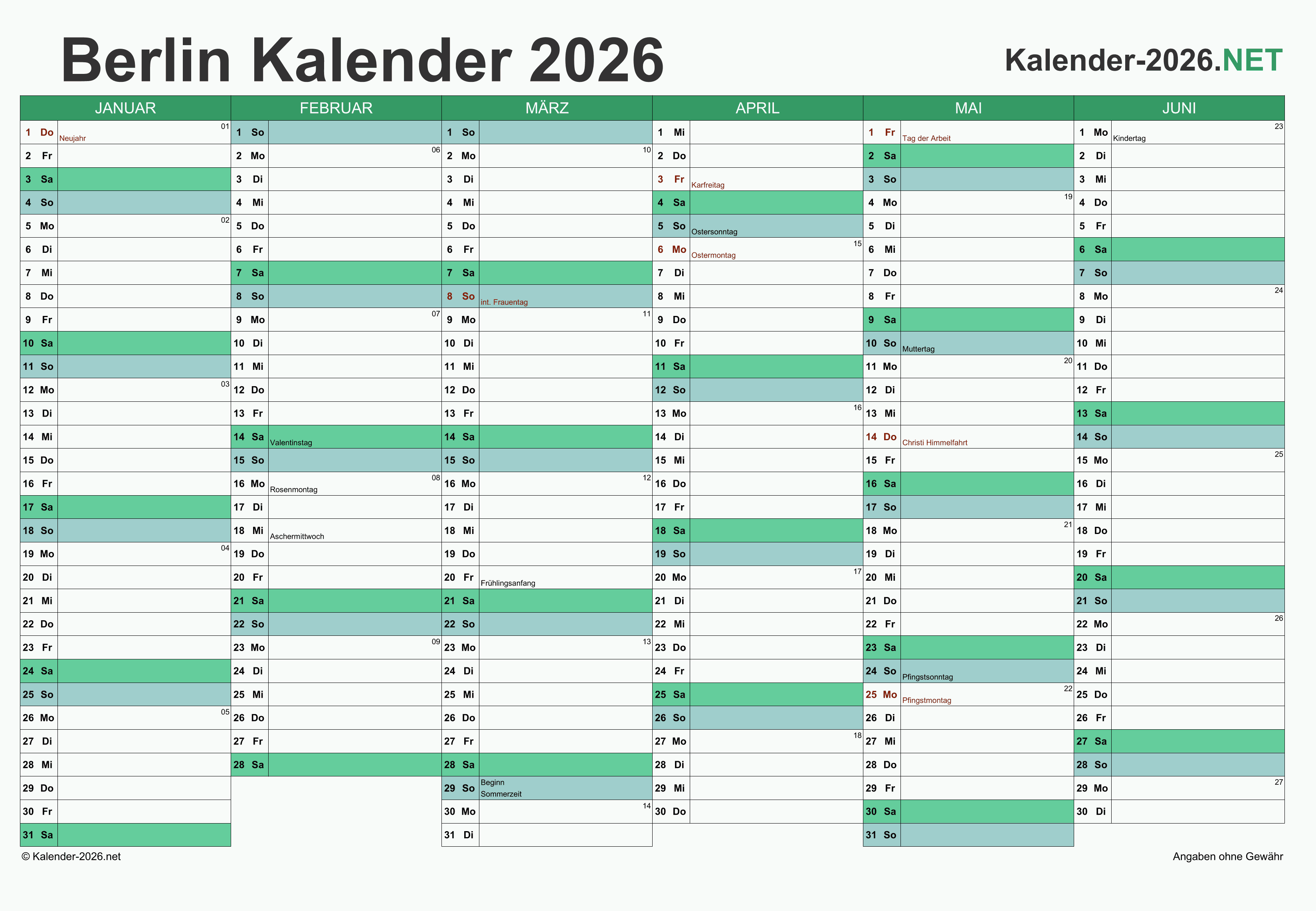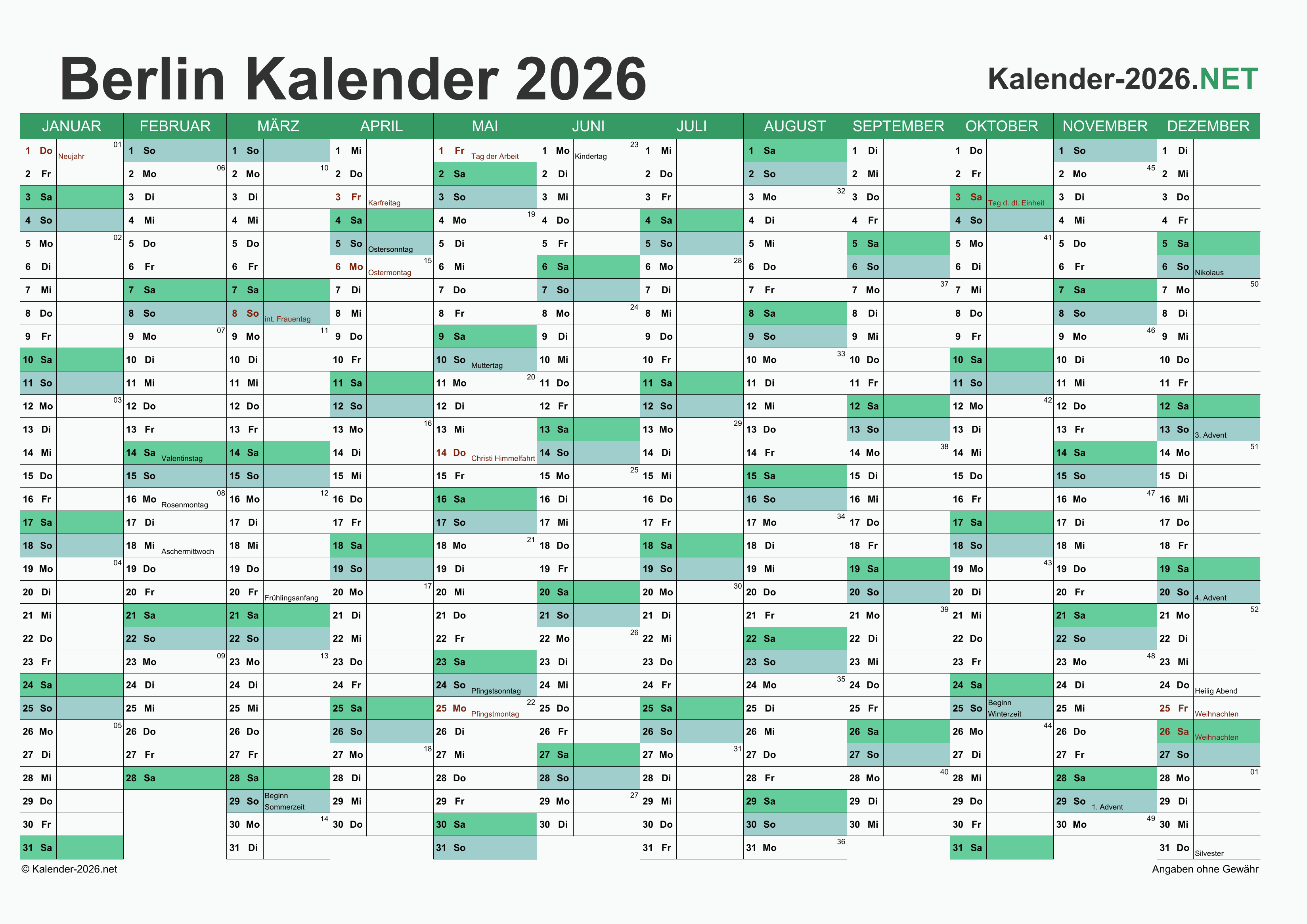 Hier finden Sie kostenlose Kalender 2026 für Berlin mit gesetzlichen Feiertagen und Kalenderwochen. Diese Kalendervorlagen im DIN A4-Querformat können ideal als Jahres- und Terminplaner, Notizkalender, Bürokalender, Arbeitskalender, Urlaubsplaner oder Familienkalender verwendet werden.
