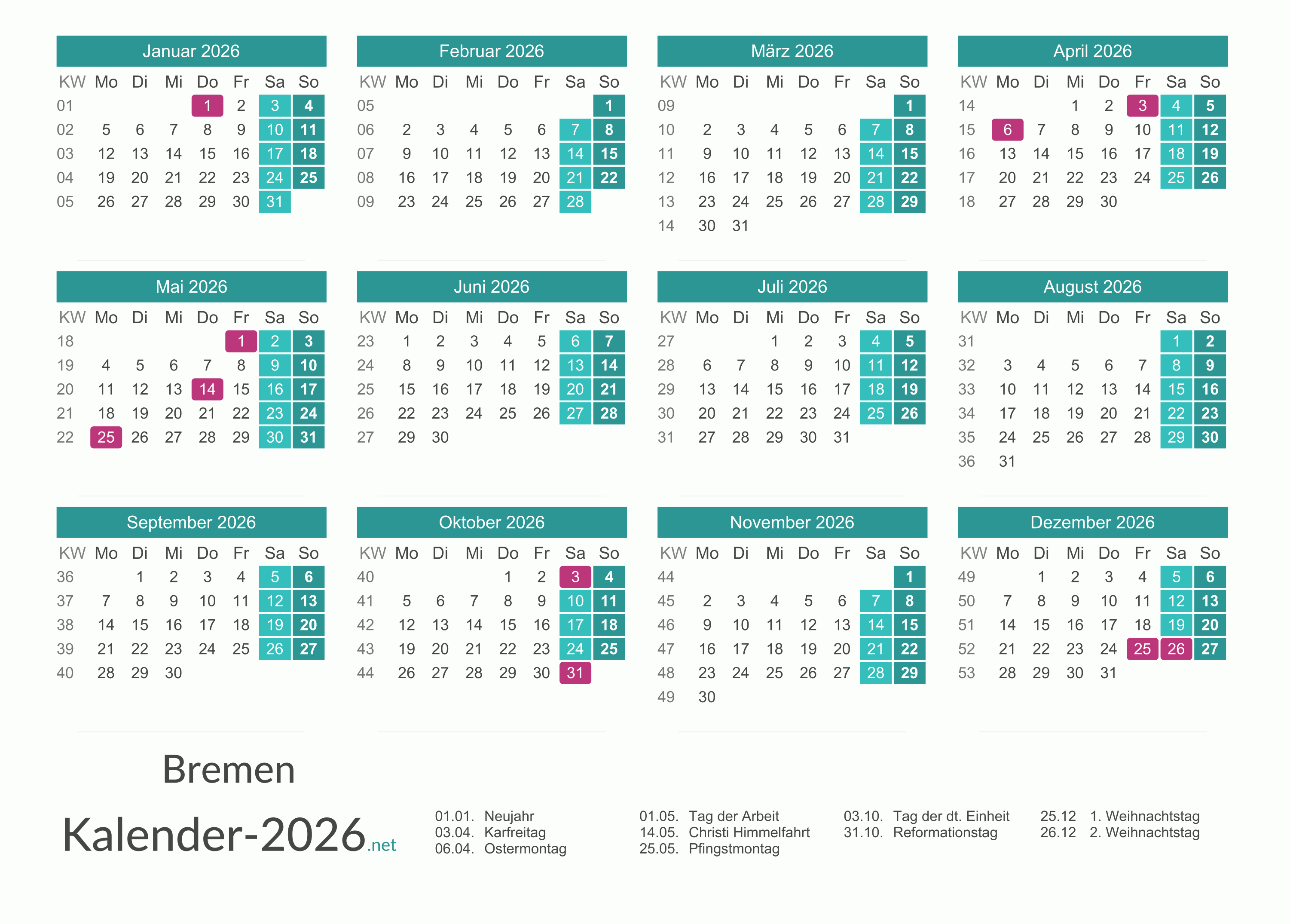 Die hier aufgeführten Feiertage erzeugen ein langes Wochenende, da sie auf einen Freitag oder Montag fallen. Die Angaben zu Datum, Wochentag und Kalenderwoche beziehen sich auf die jeweiligen langen Wochenenden in Bremen 2026.