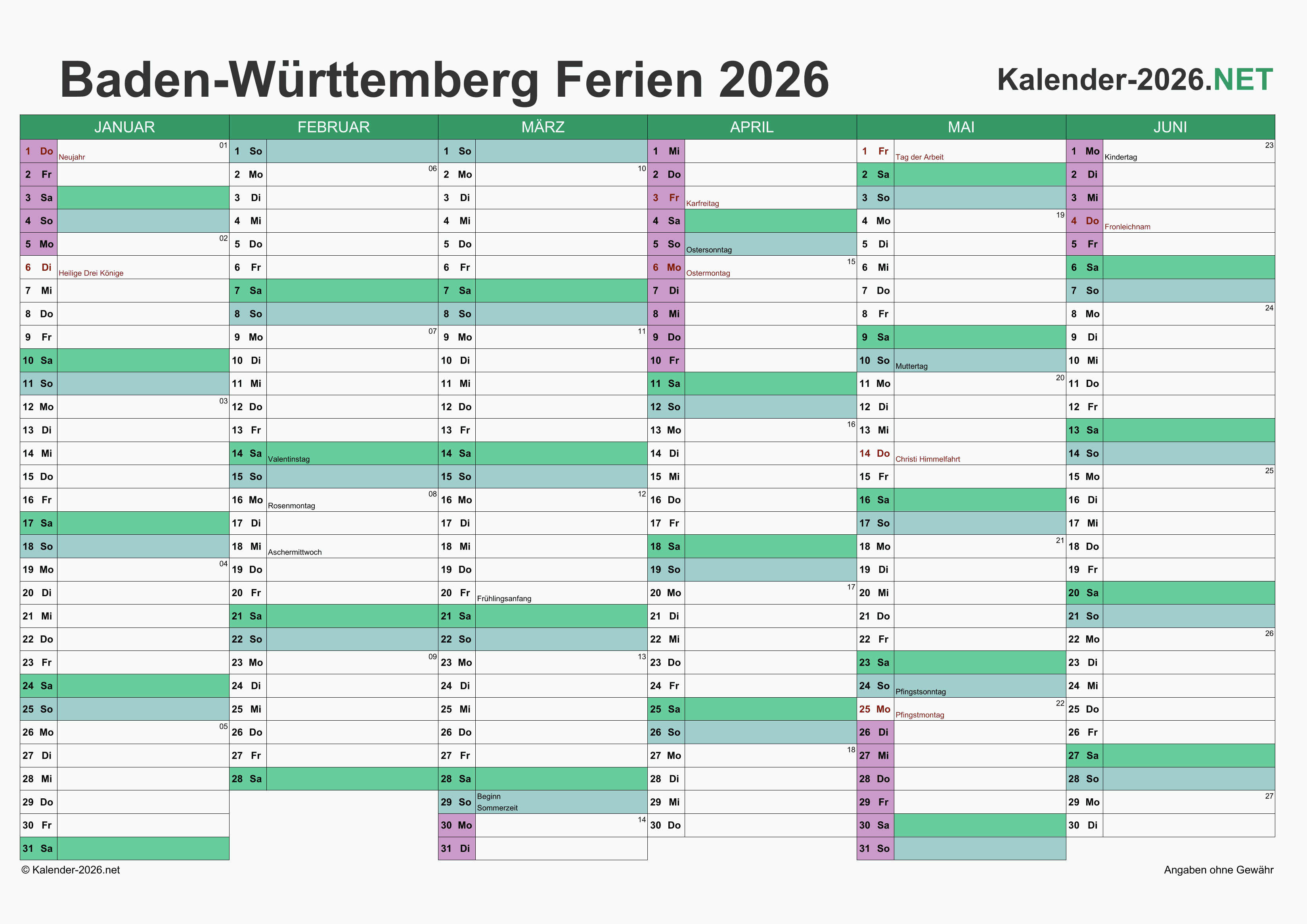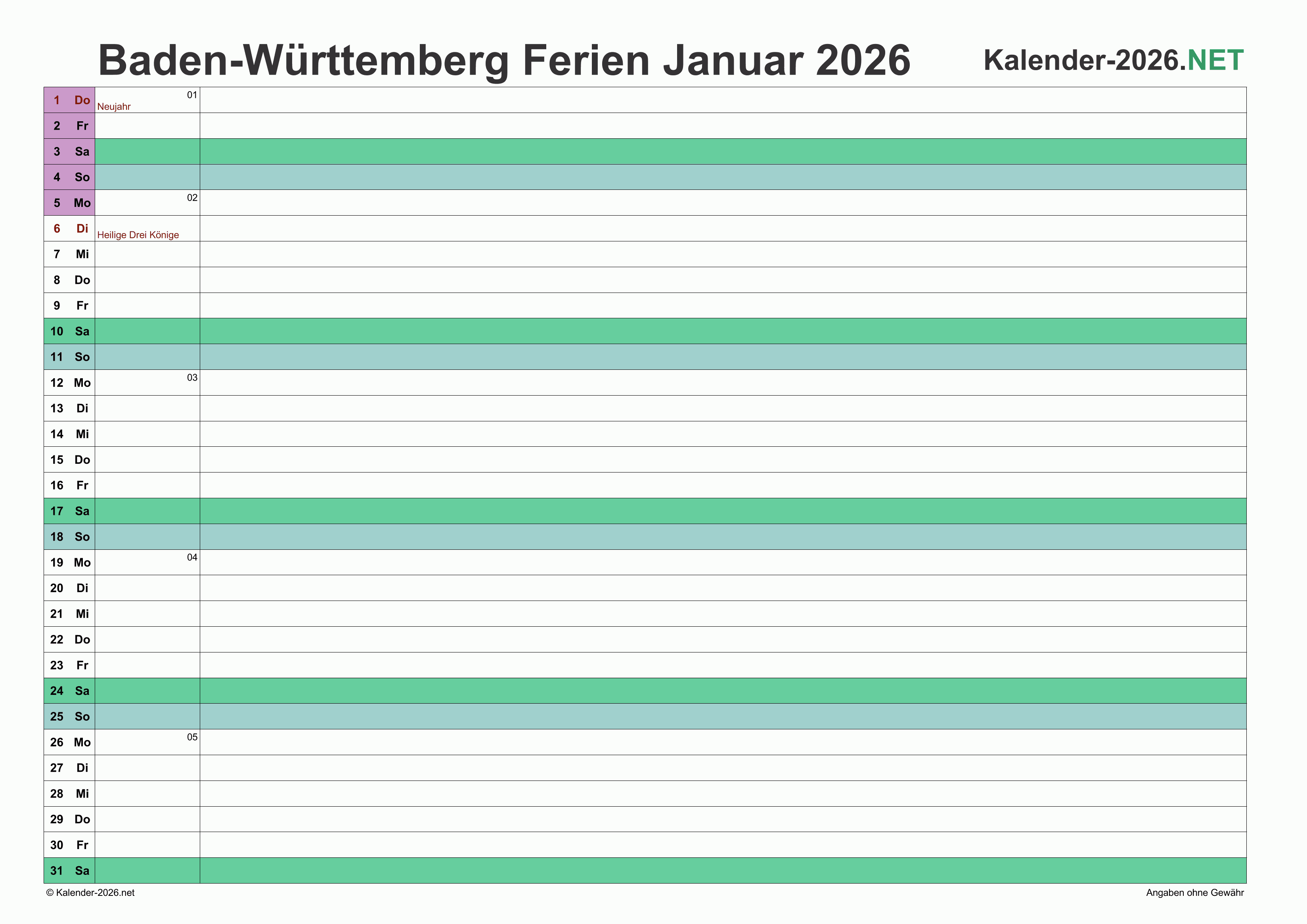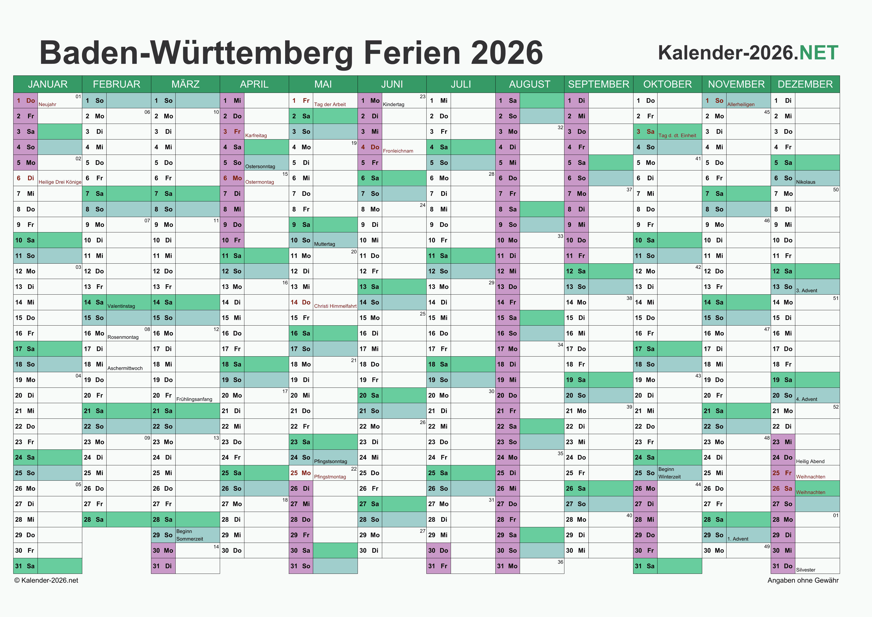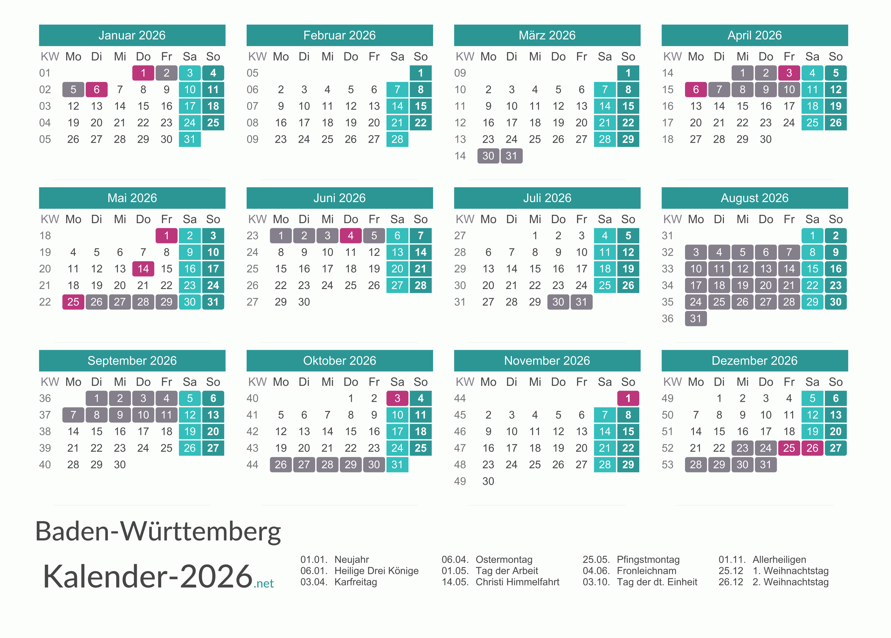 Hier finden Sie kostenlose Kalender mit den Ferien Baden-Württemberg 2026, gesetzlichen Feiertagen und Kalenderwochen. Die Kalendervordrucke können wunderbar als Jahresplaner, Schulkalender, Ferienkalender, Unterrichtskalender, Reise- und Urlaubsplaner oder als Familienkalender verwendet werden.