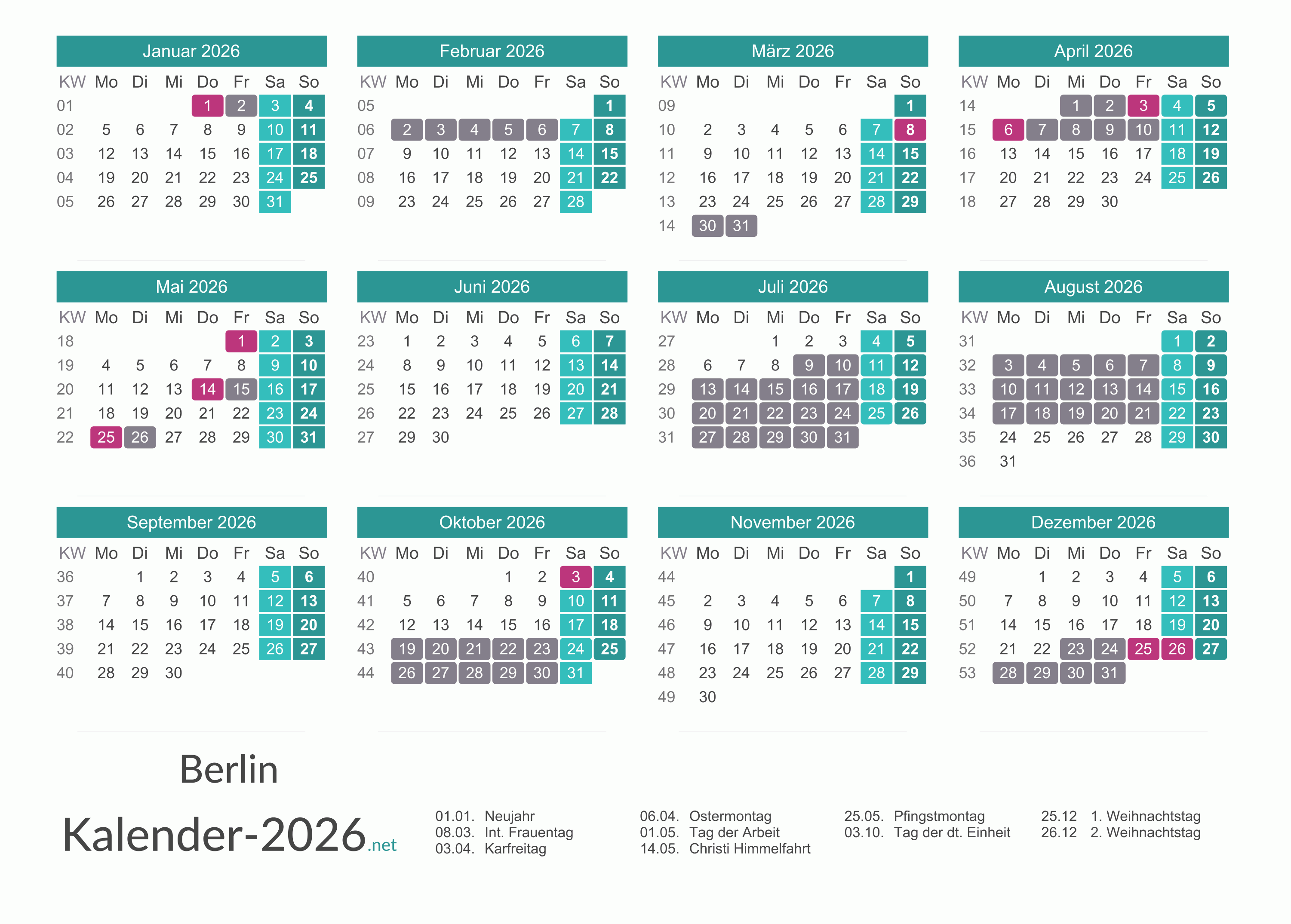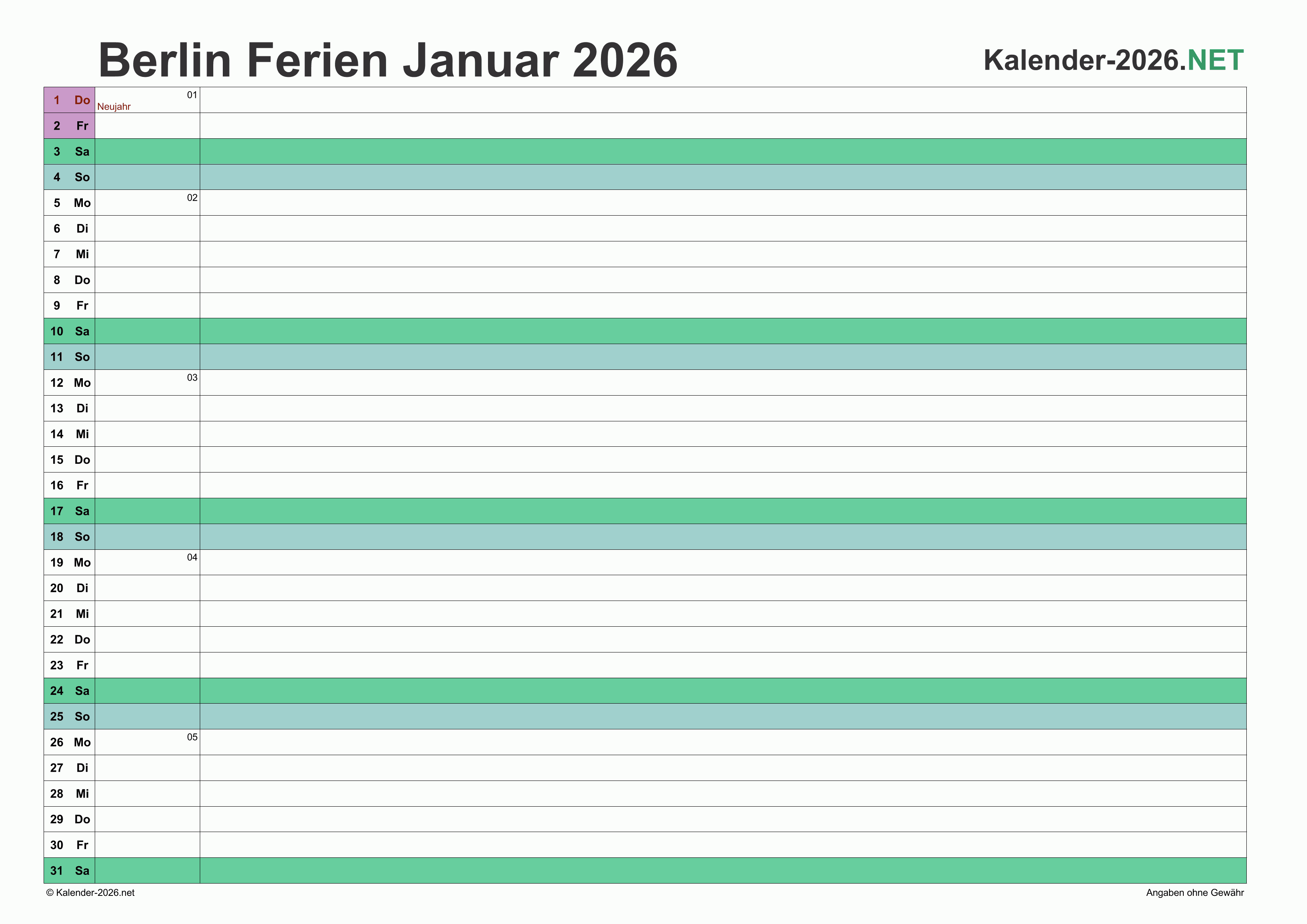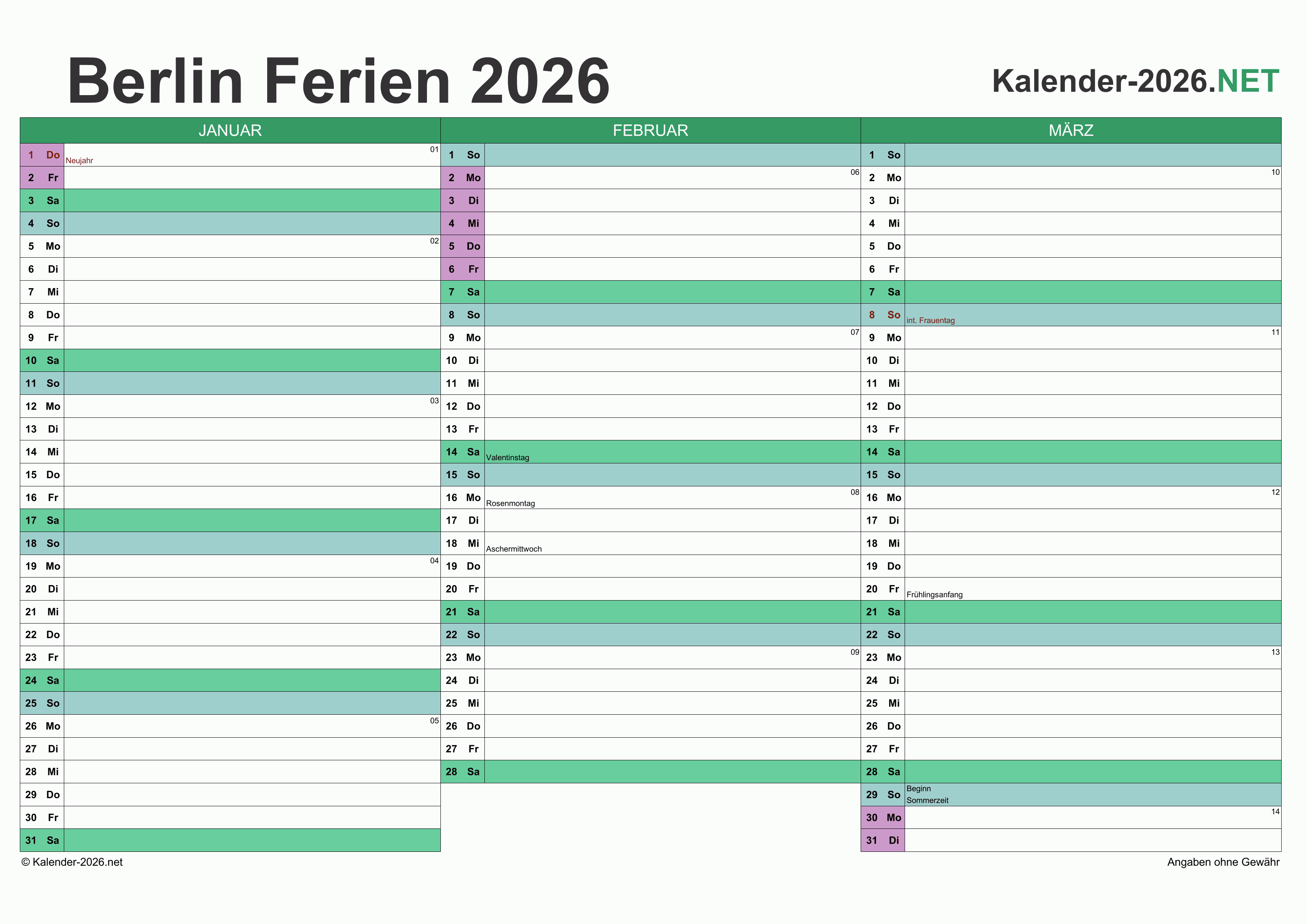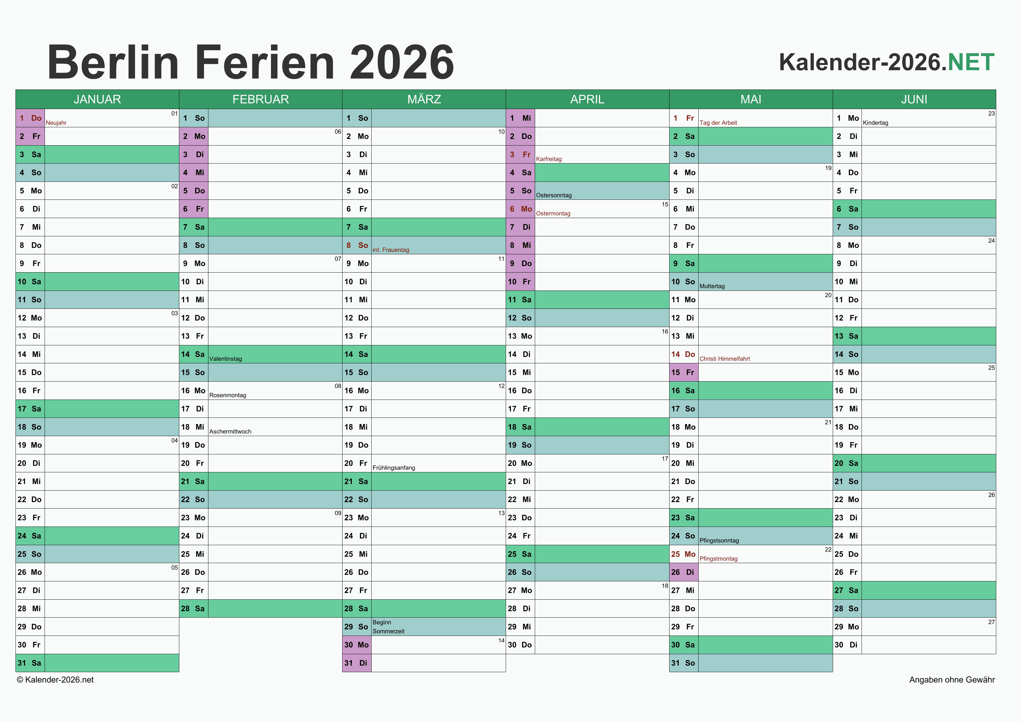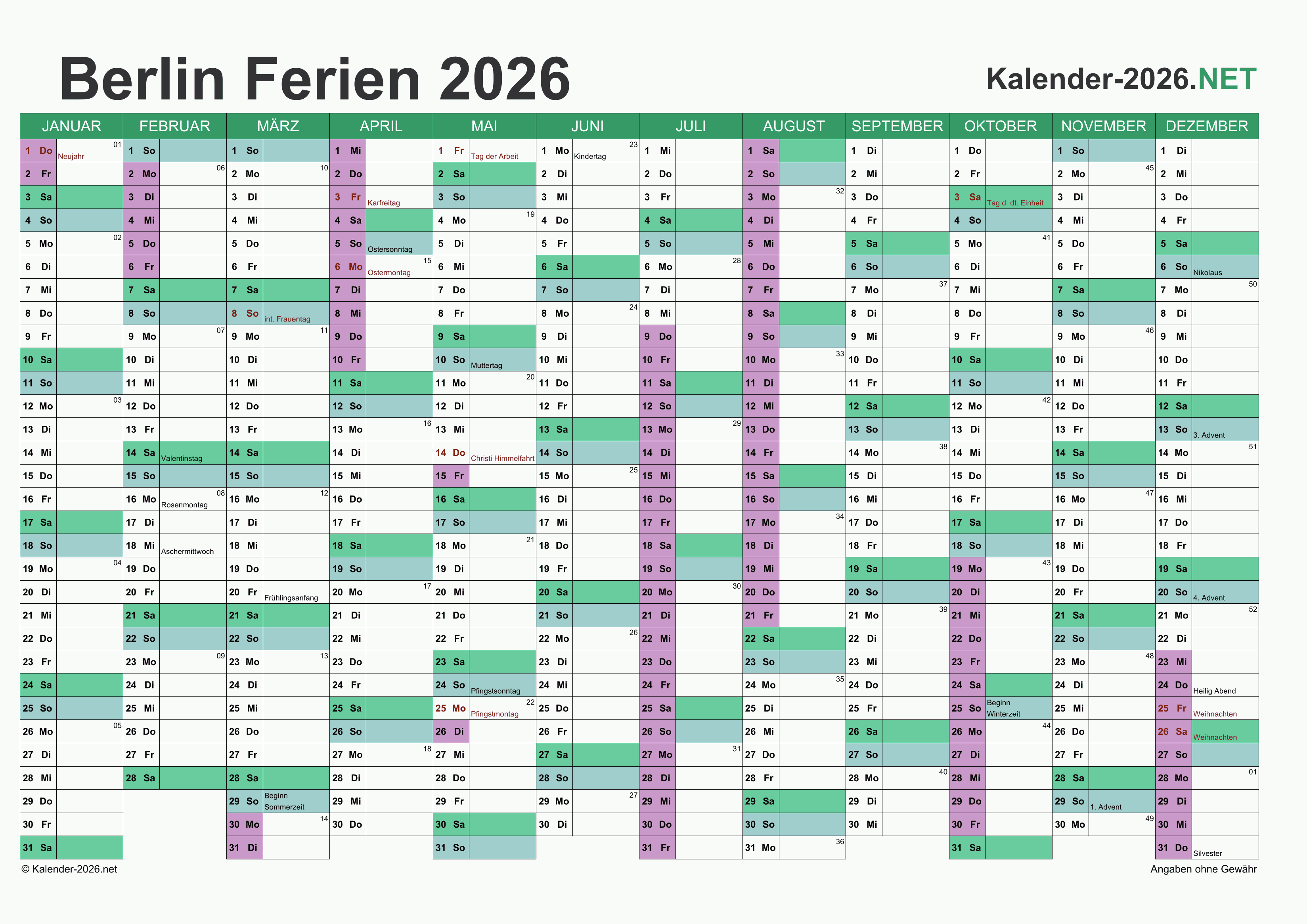 Hier finden Sie kostenlose Kalender mit den Ferien Berlin 2026, gesetzlichen Feiertagen und Kalenderwochen. Die Kalendervordrucke können wunderbar als Jahresplaner, Schulkalender, Ferienkalender, Unterrichtskalender, Reise- und Urlaubsplaner oder als Familienkalender verwendet werden.