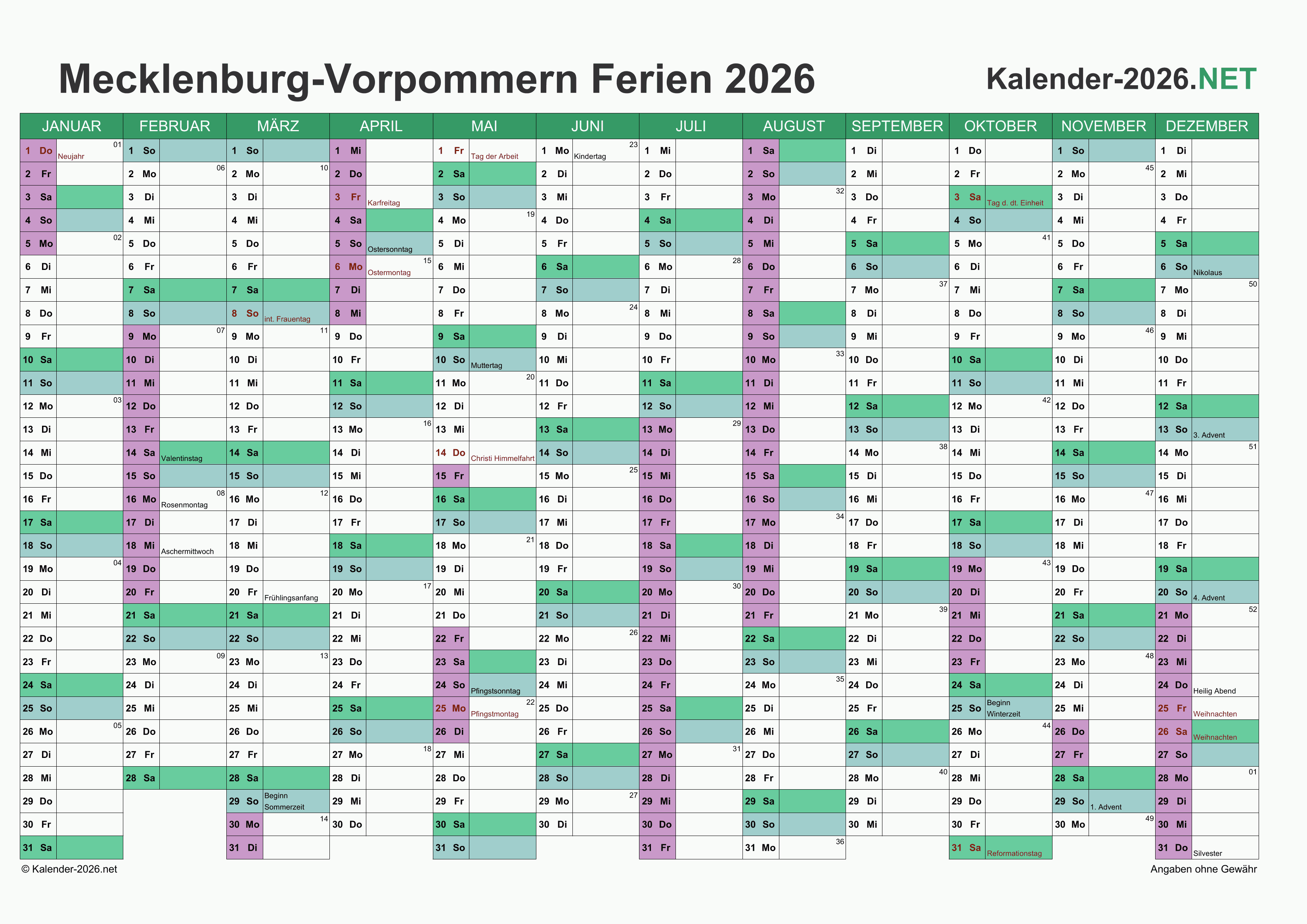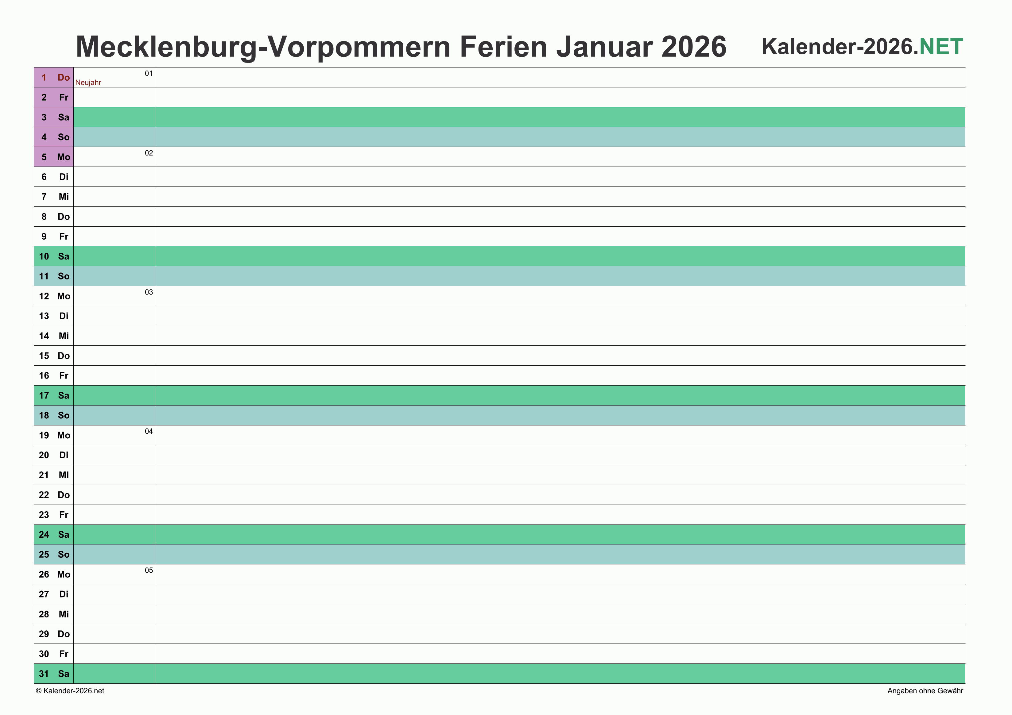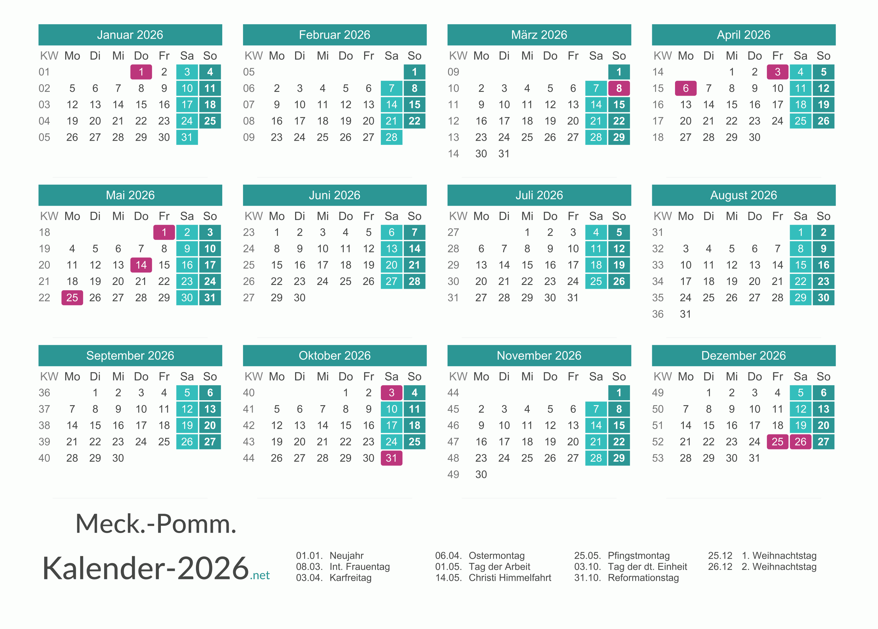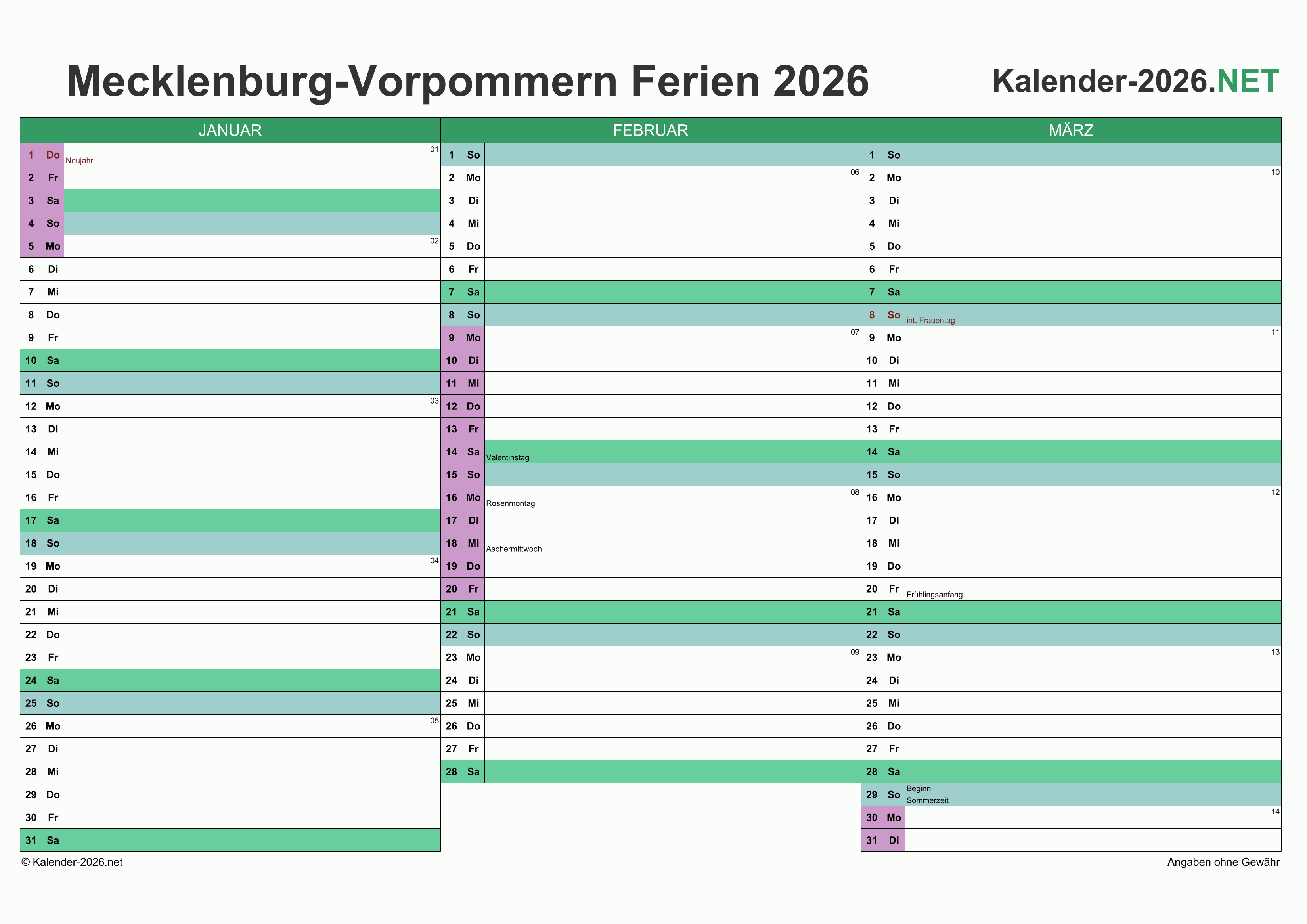 Hier finden Sie kostenlose Kalender mit den Ferien Meck-Pomm 2026, gesetzlichen Feiertagen und Kalenderwochen. Die Kalendervordrucke können wunderbar als Jahresplaner, Schulkalender, Ferienkalender, Unterrichtskalender, Reise- und Urlaubsplaner oder als Familienkalender verwendet werden.