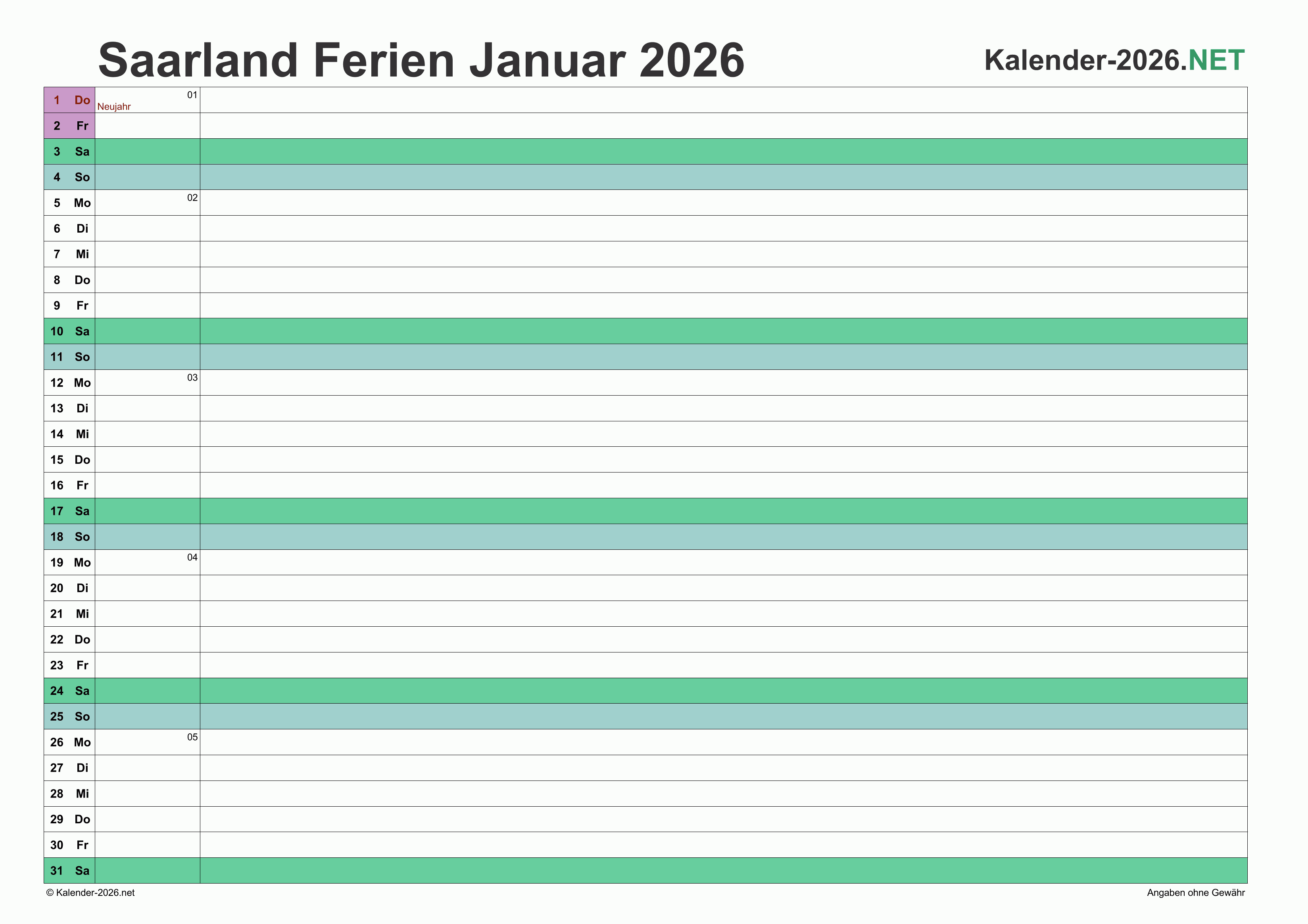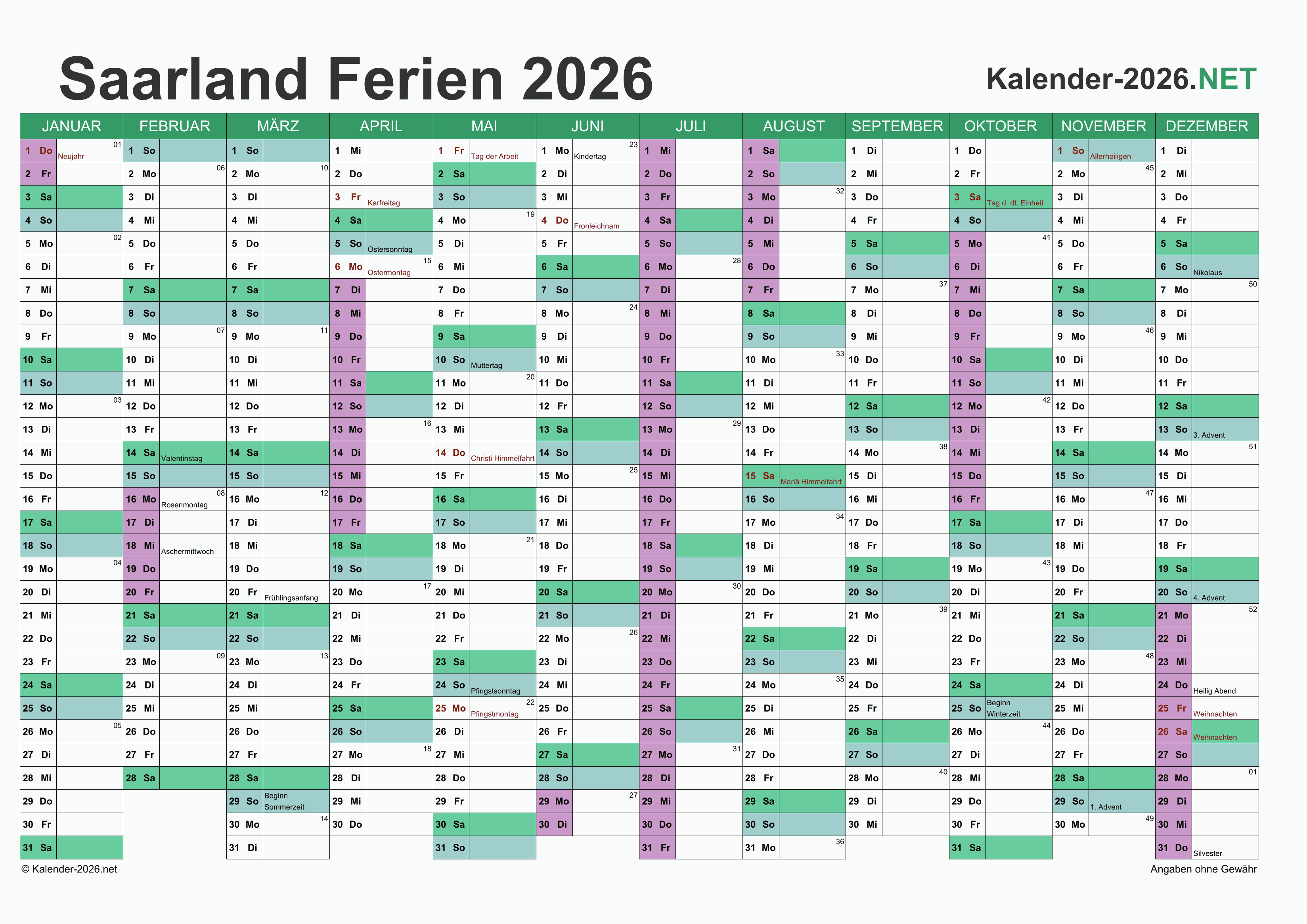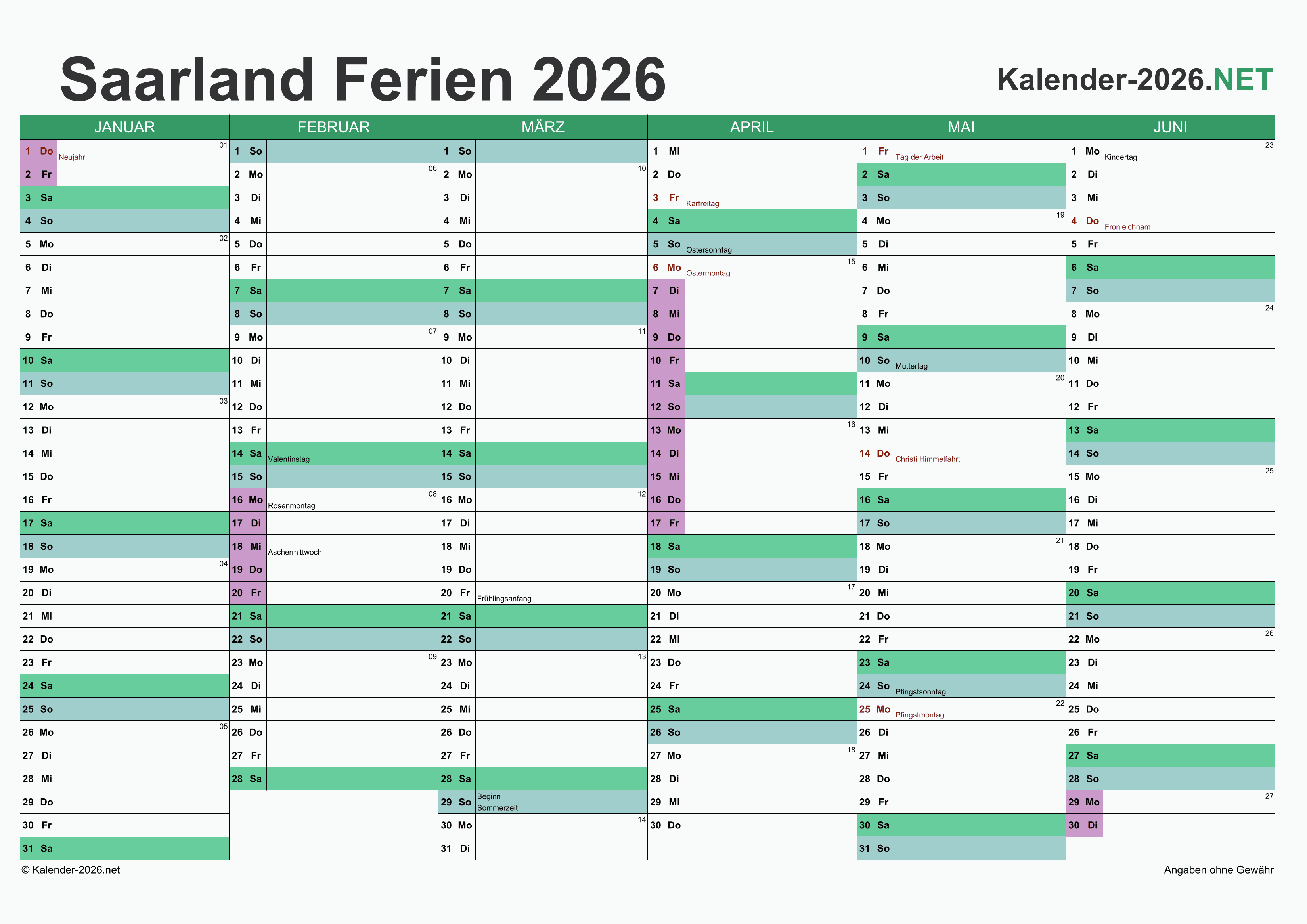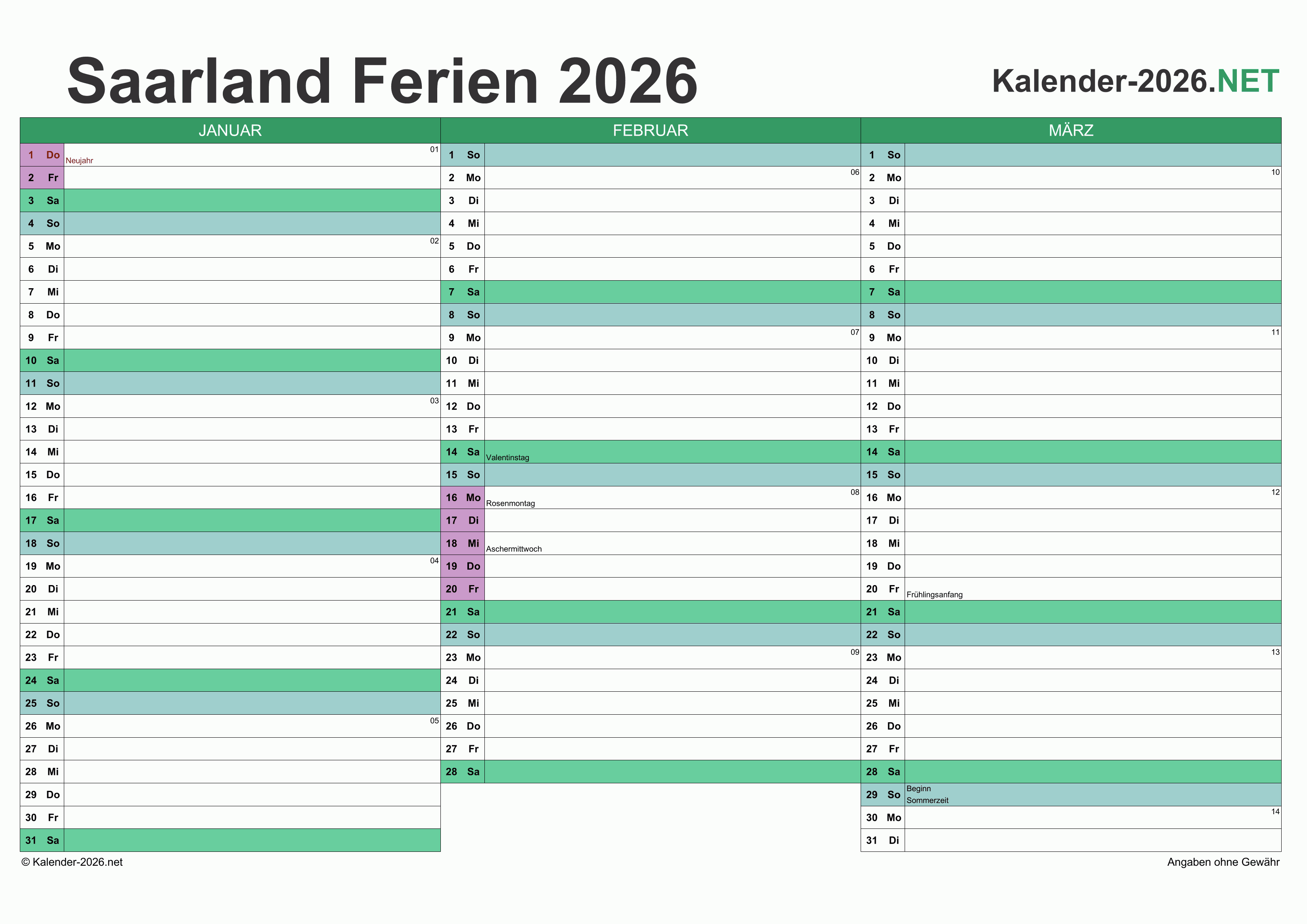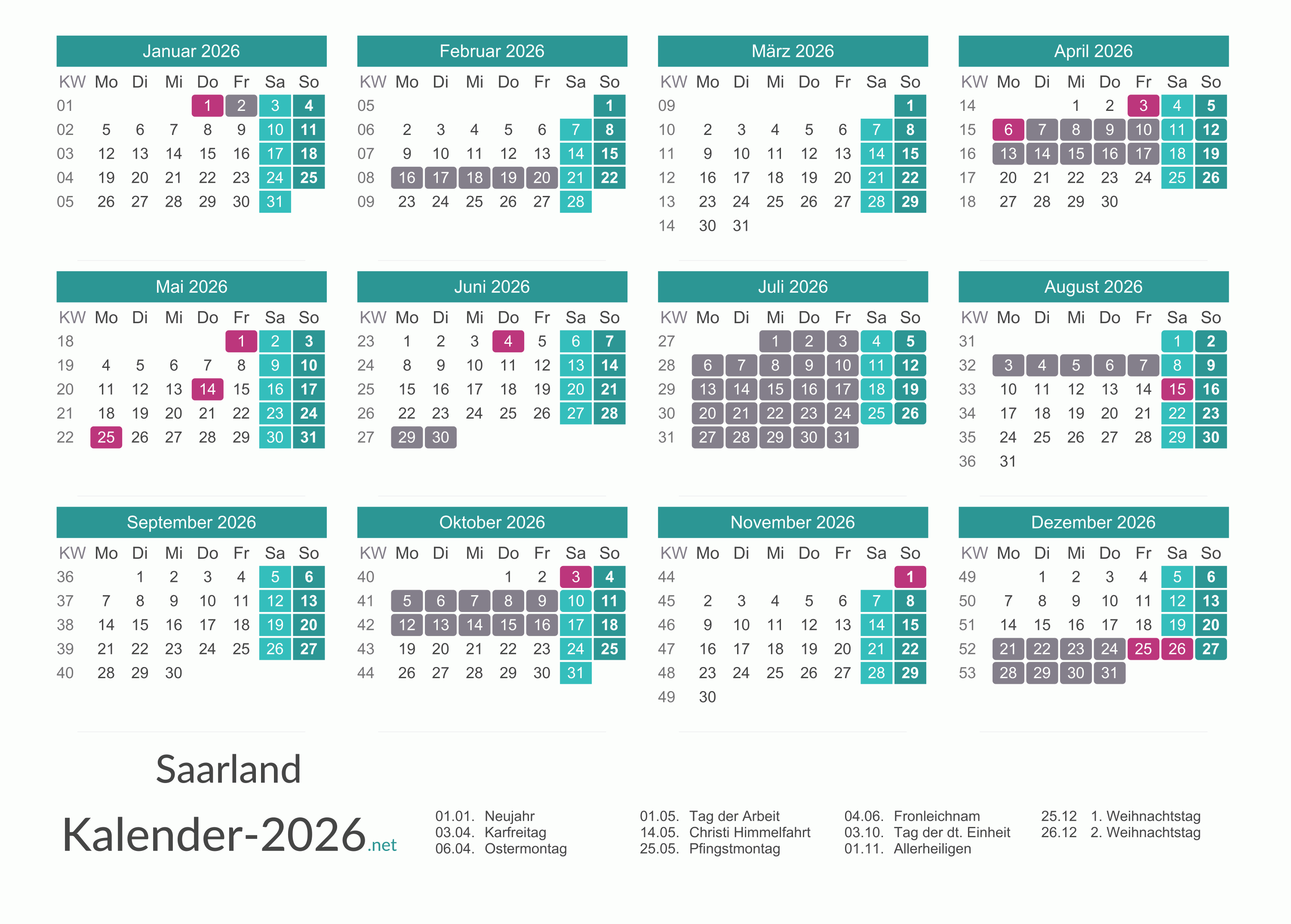 Hier finden Sie kostenlose Kalender mit den Ferien Saarland 2026, gesetzlichen Feiertagen und Kalenderwochen. Die Kalendervordrucke können wunderbar als Jahresplaner, Schulkalender, Ferienkalender, Unterrichtskalender, Reise- und Urlaubsplaner oder als Familienkalender verwendet werden.