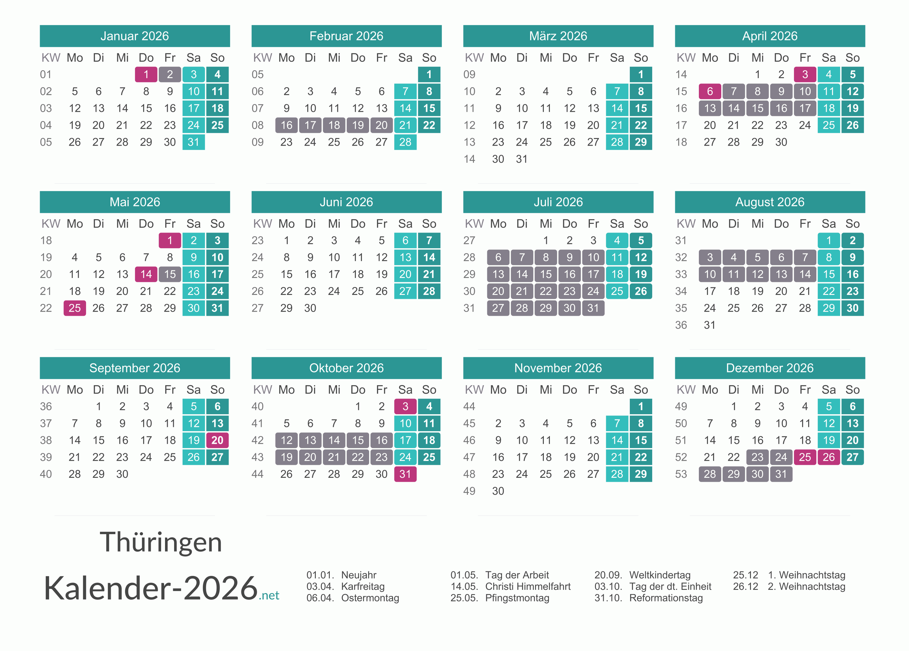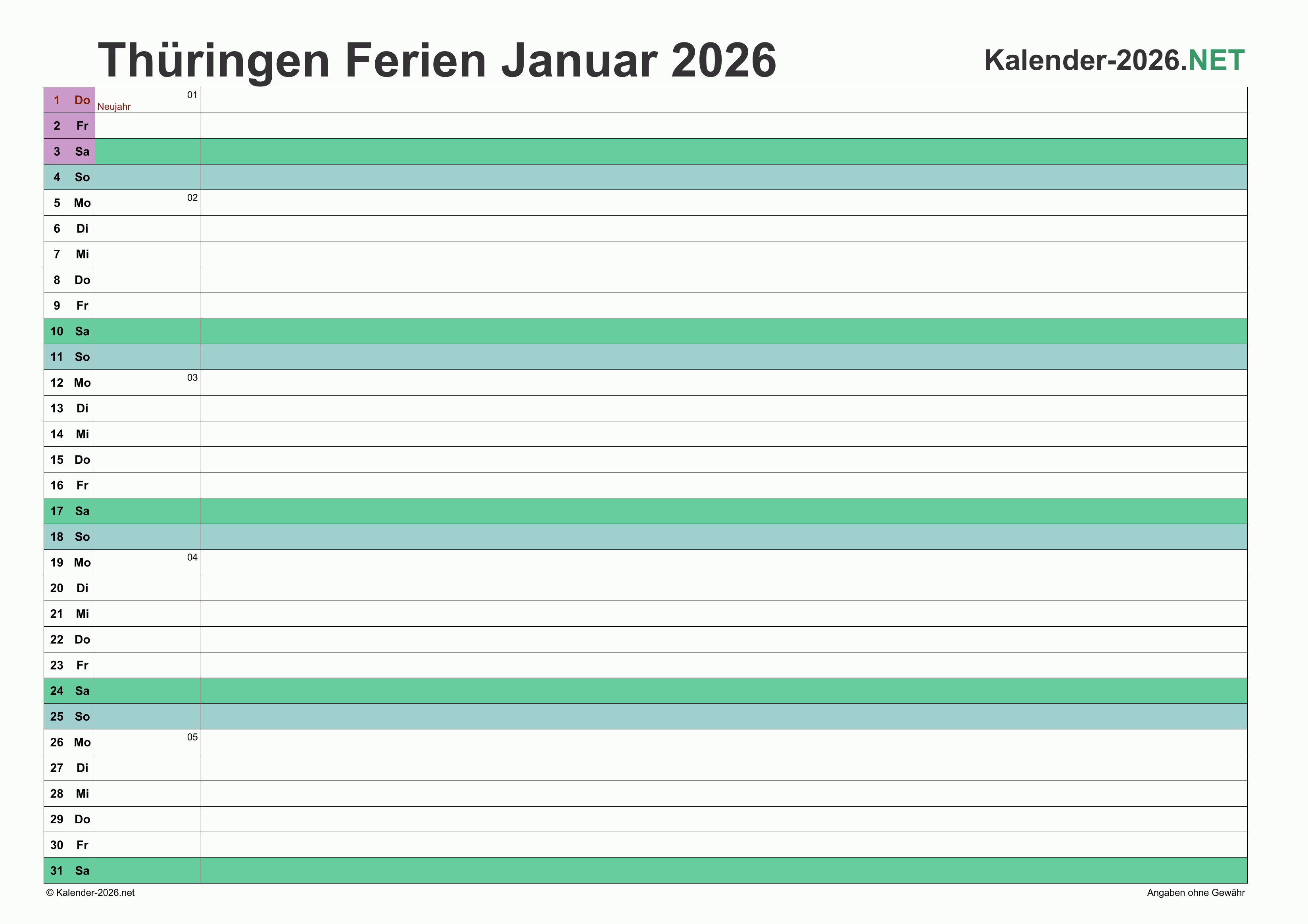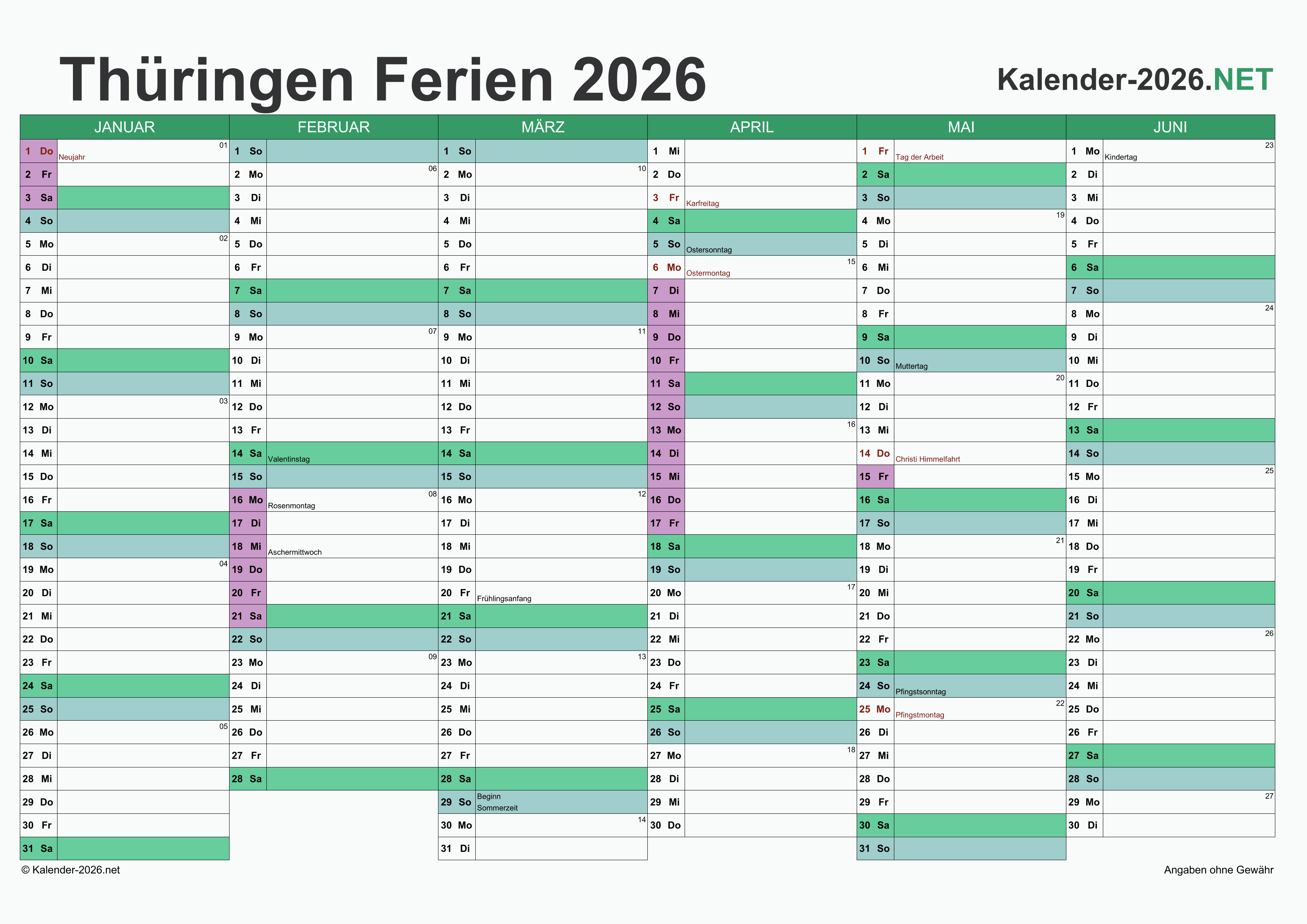 Hier finden Sie kostenlose Kalender mit den Ferien Thüringen 2026, gesetzlichen Feiertagen und Kalenderwochen. Die Kalendervordrucke können wunderbar als Jahresplaner, Schulkalender, Ferienkalender, Unterrichtskalender, Reise- und Urlaubsplaner oder als Familienkalender verwendet werden.