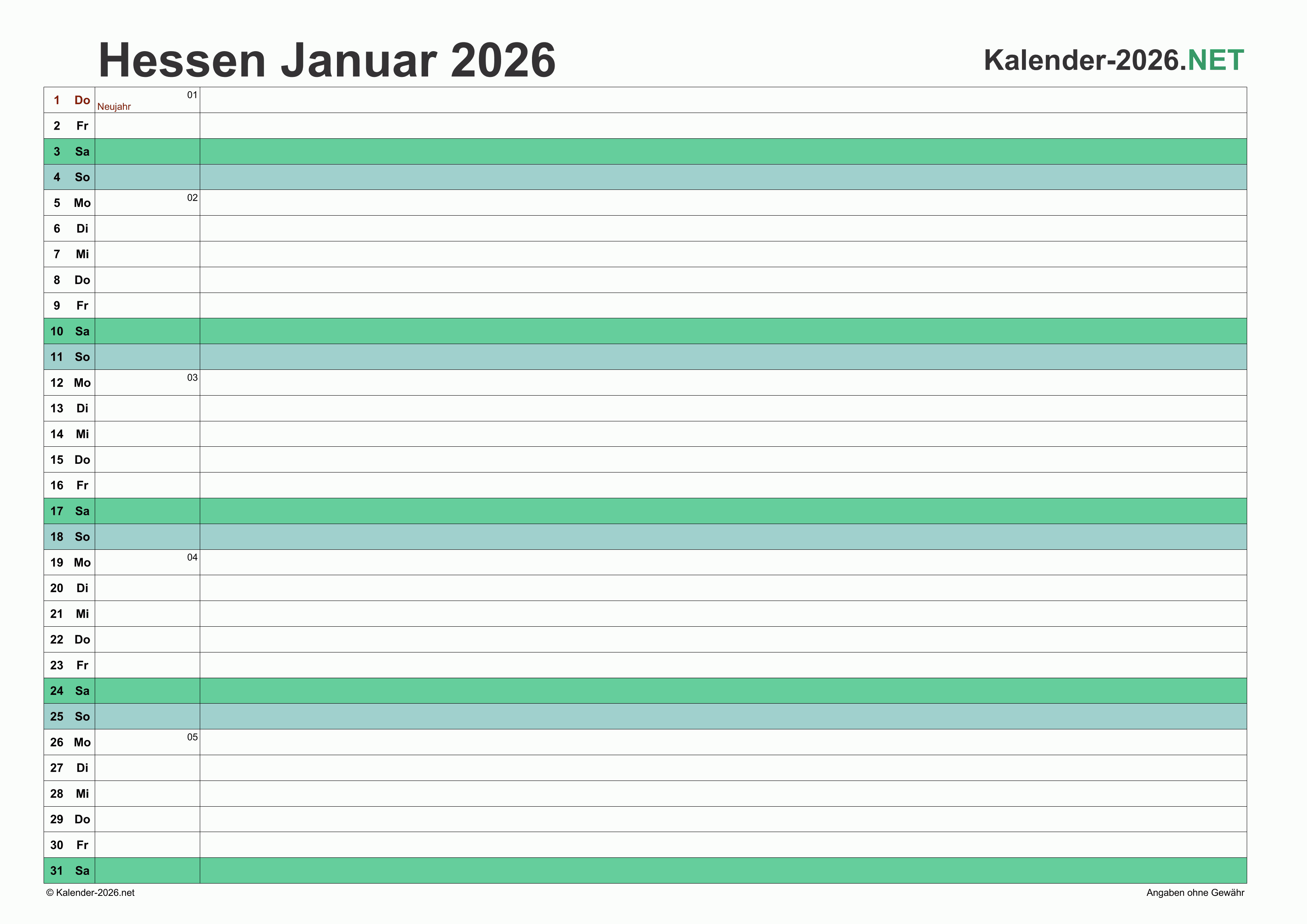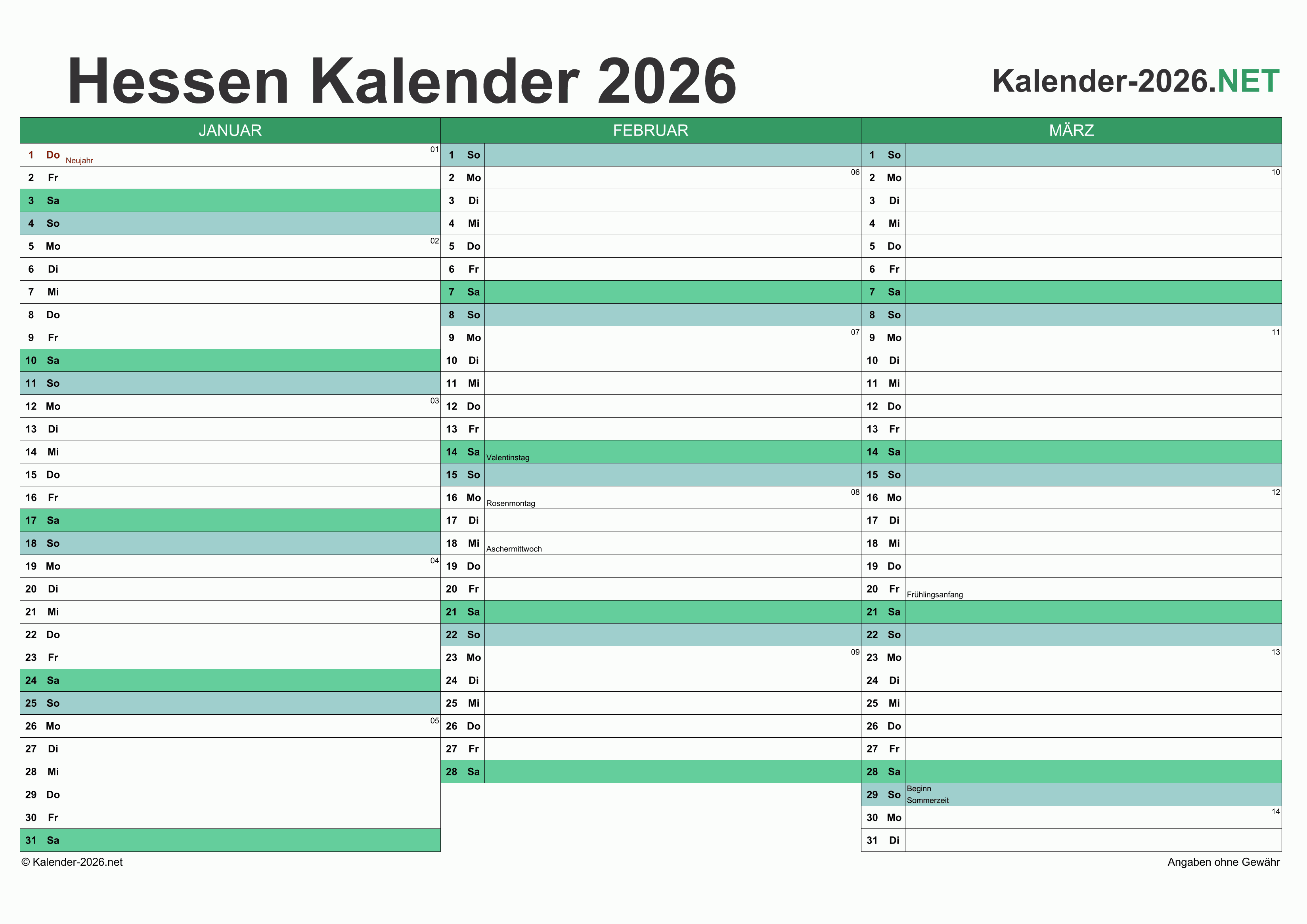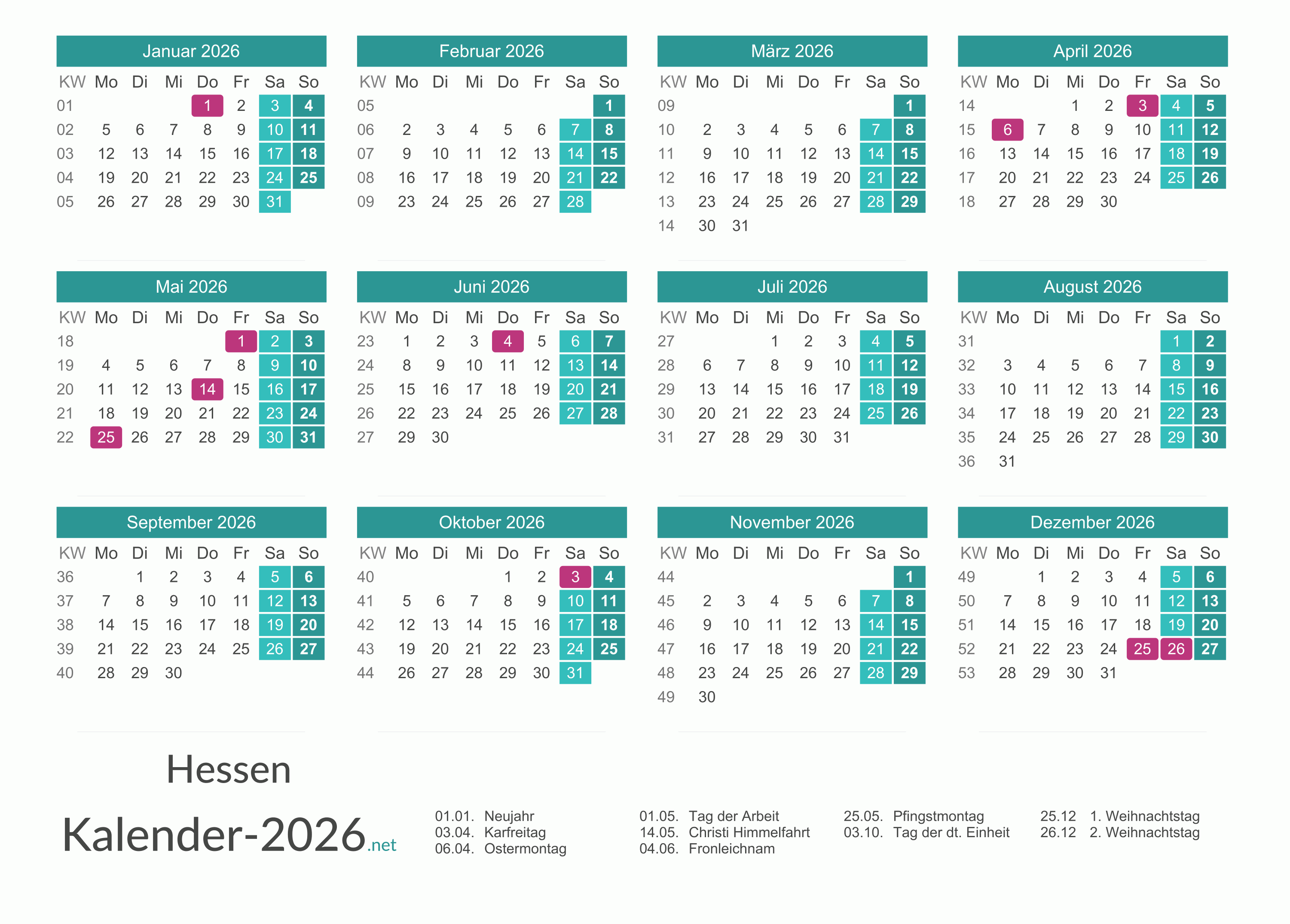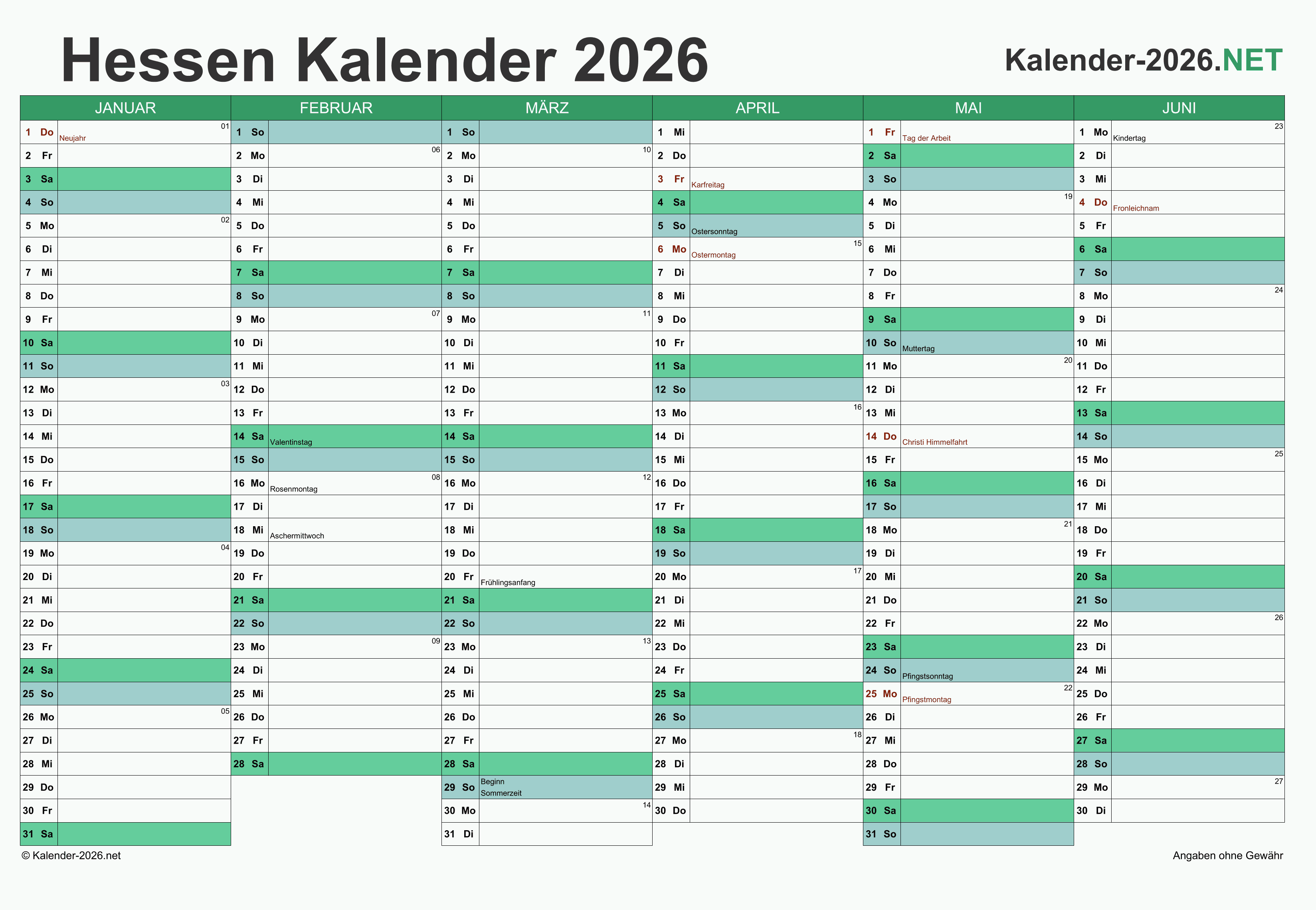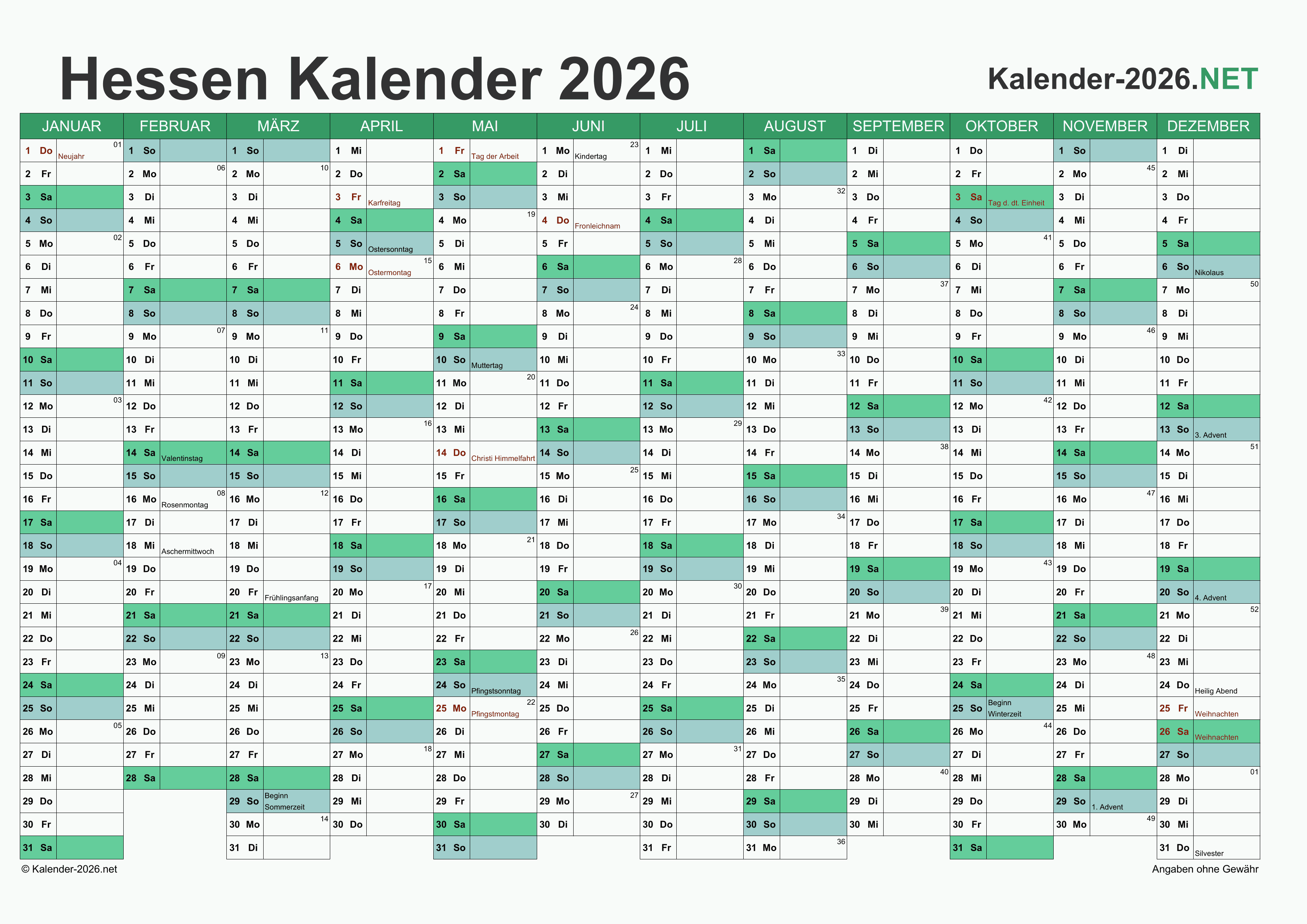 Hier finden Sie kostenlose Kalender 2026 für Hessen mit gesetzlichen Feiertagen und Kalenderwochen. Diese Kalendervorlagen im DIN A4-Querformat können ideal als Jahres- und Terminplaner, Notizkalender, Bürokalender, Arbeitskalender, Urlaubsplaner oder Familienkalender verwendet werden.
