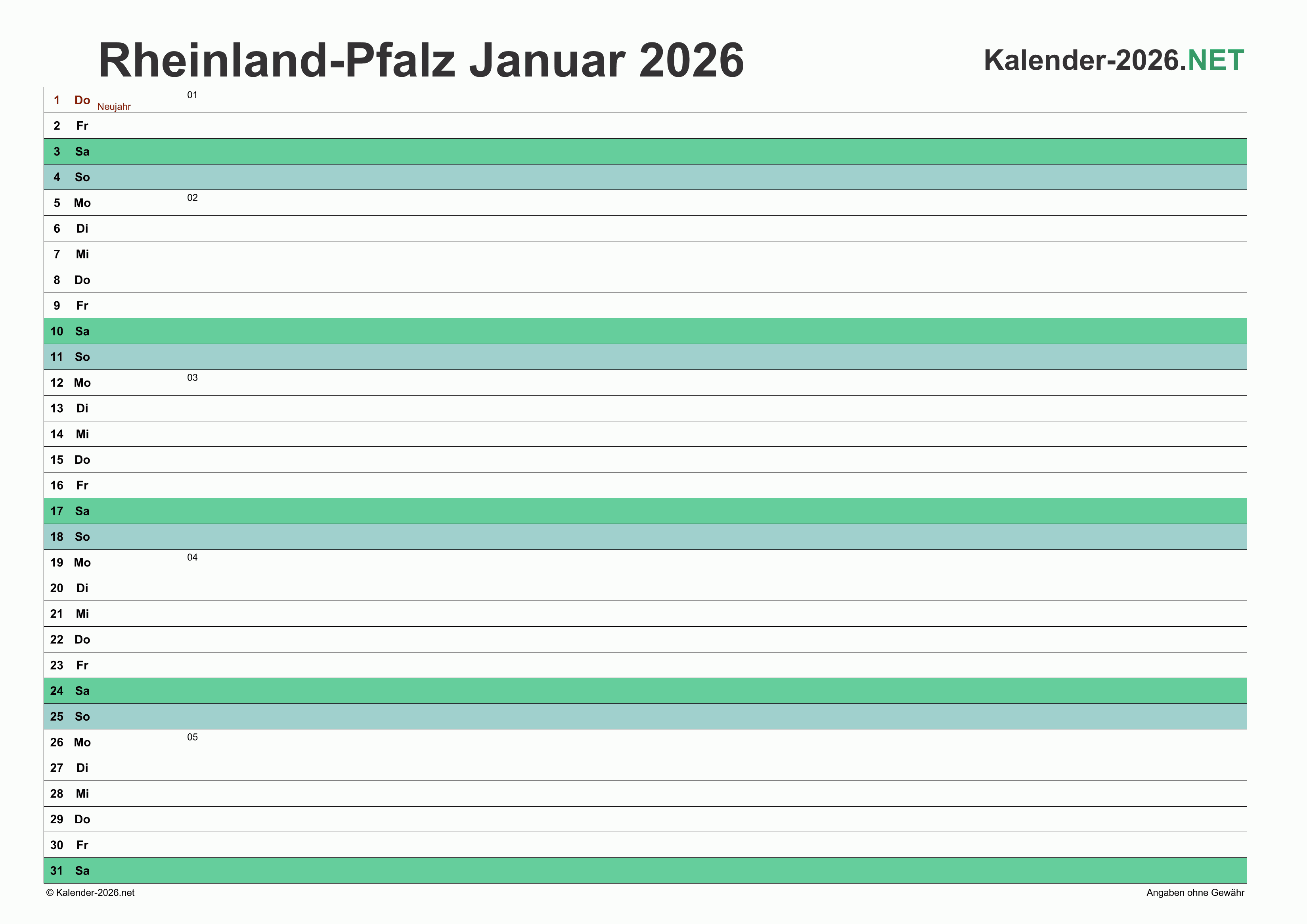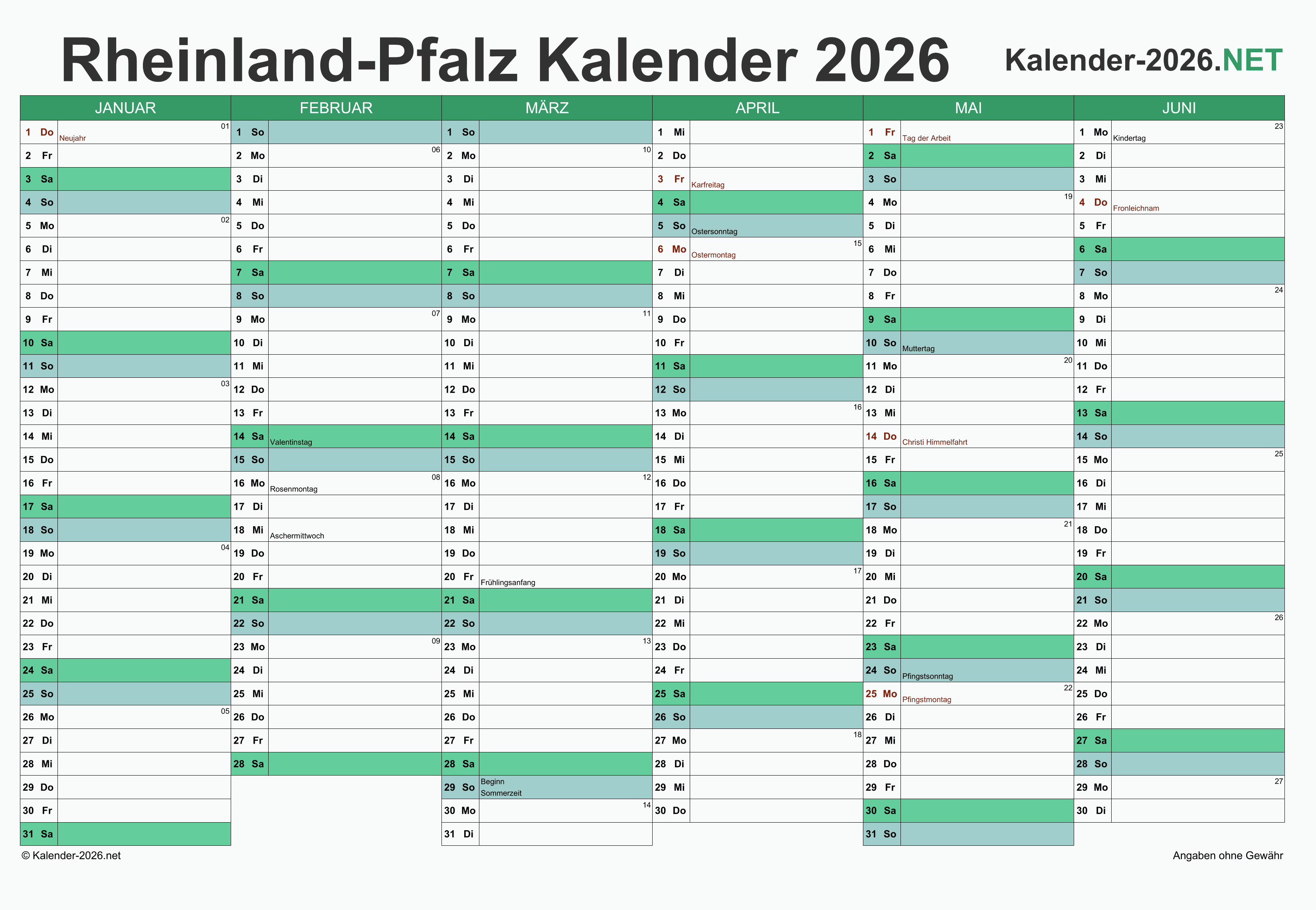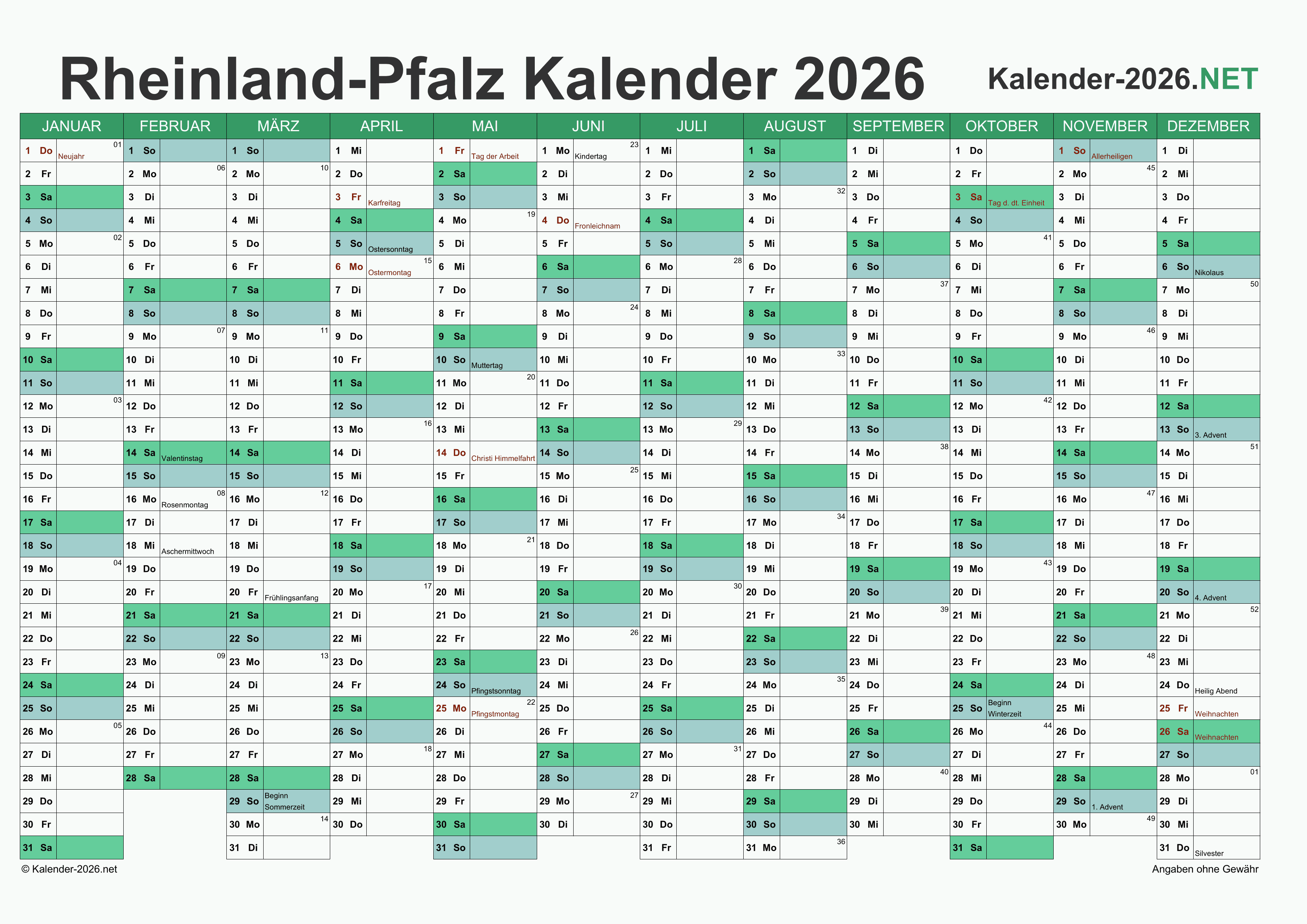 Hier finden Sie kostenlose Kalender 2026 für Rheinland-Pfalz mit gesetzlichen Feiertagen und Kalenderwochen. Diese Kalendervorlagen im DIN A4-Querformat können ideal als Jahres- und Terminplaner, Notizkalender, Bürokalender, Arbeitskalender, Urlaubsplaner oder Familienkalender verwendet werden.