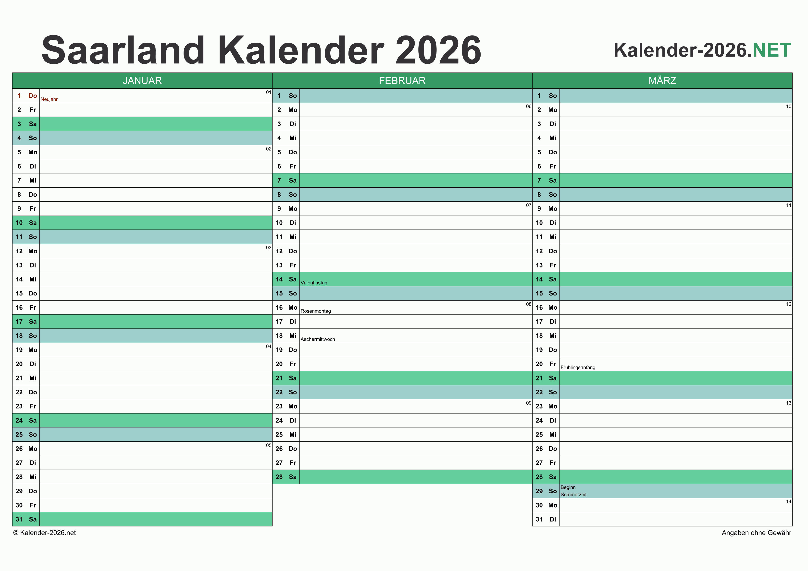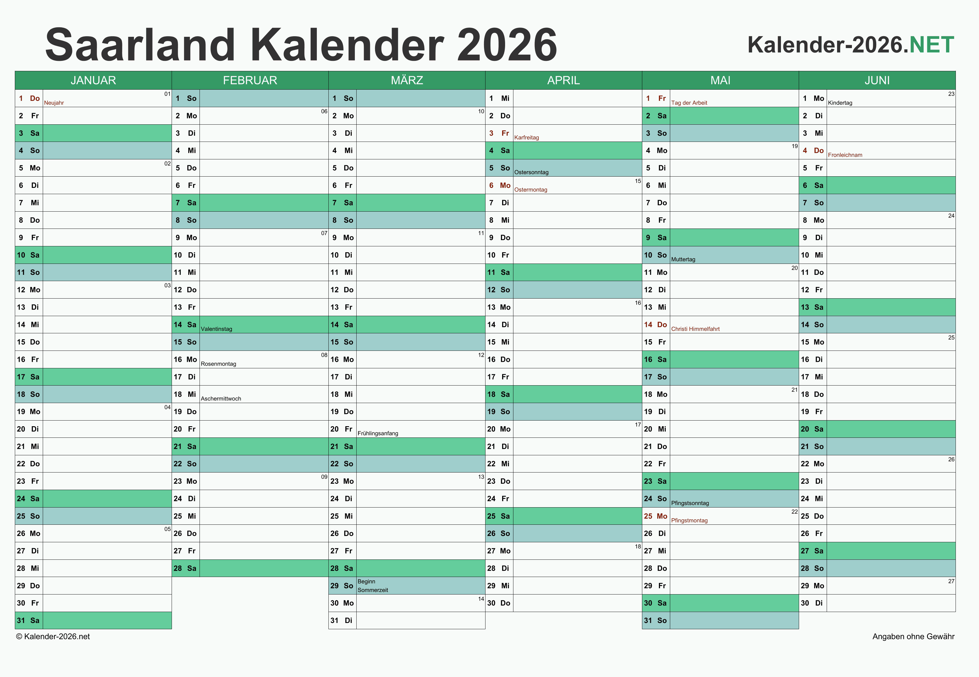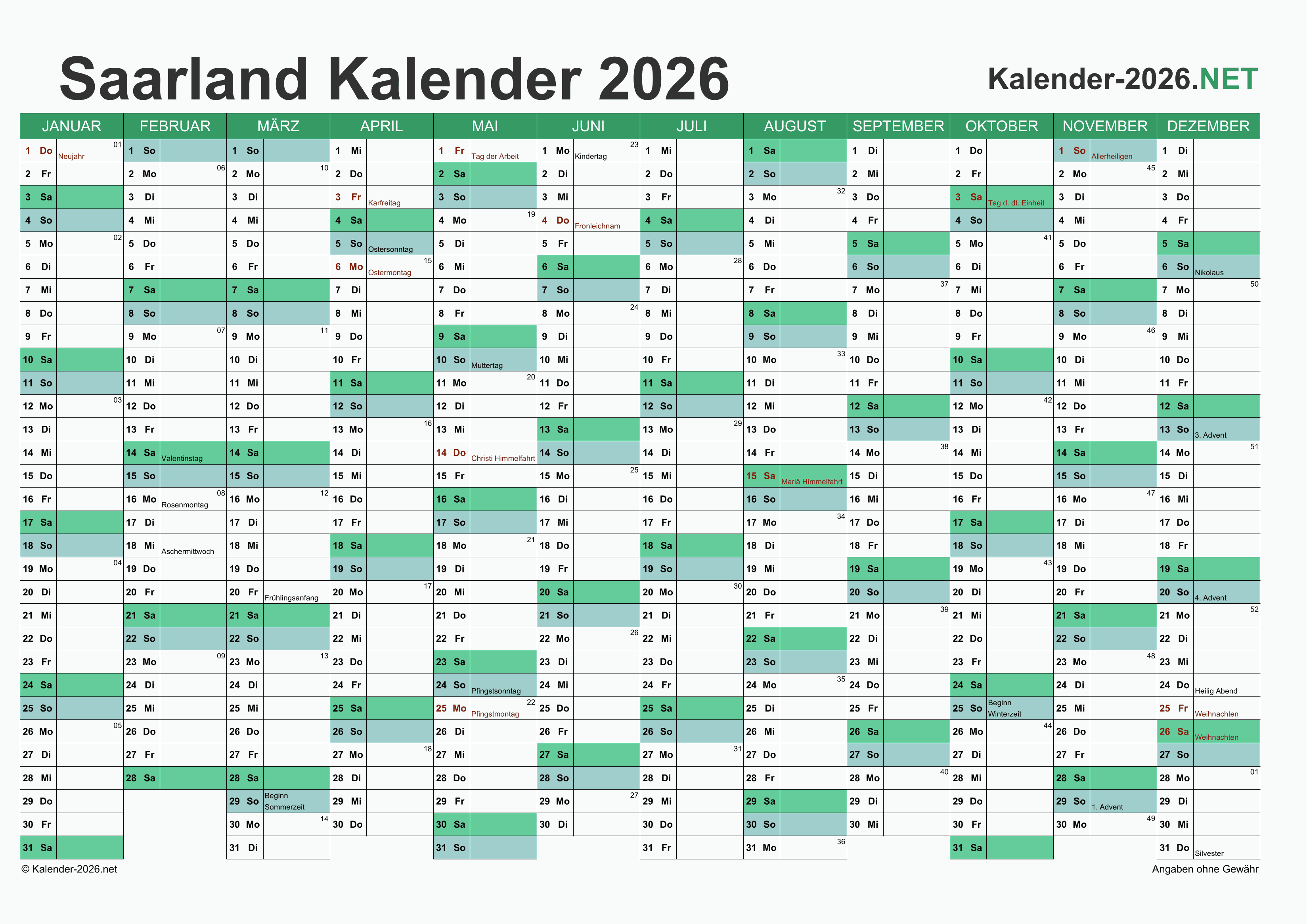 Hier finden Sie kostenlose Kalender 2026 für Saarland mit gesetzlichen Feiertagen und Kalenderwochen. Diese Kalendervorlagen im DIN A4-Querformat können ideal als Jahres- und Terminplaner, Notizkalender, Bürokalender, Arbeitskalender, Urlaubsplaner oder Familienkalender verwendet werden.