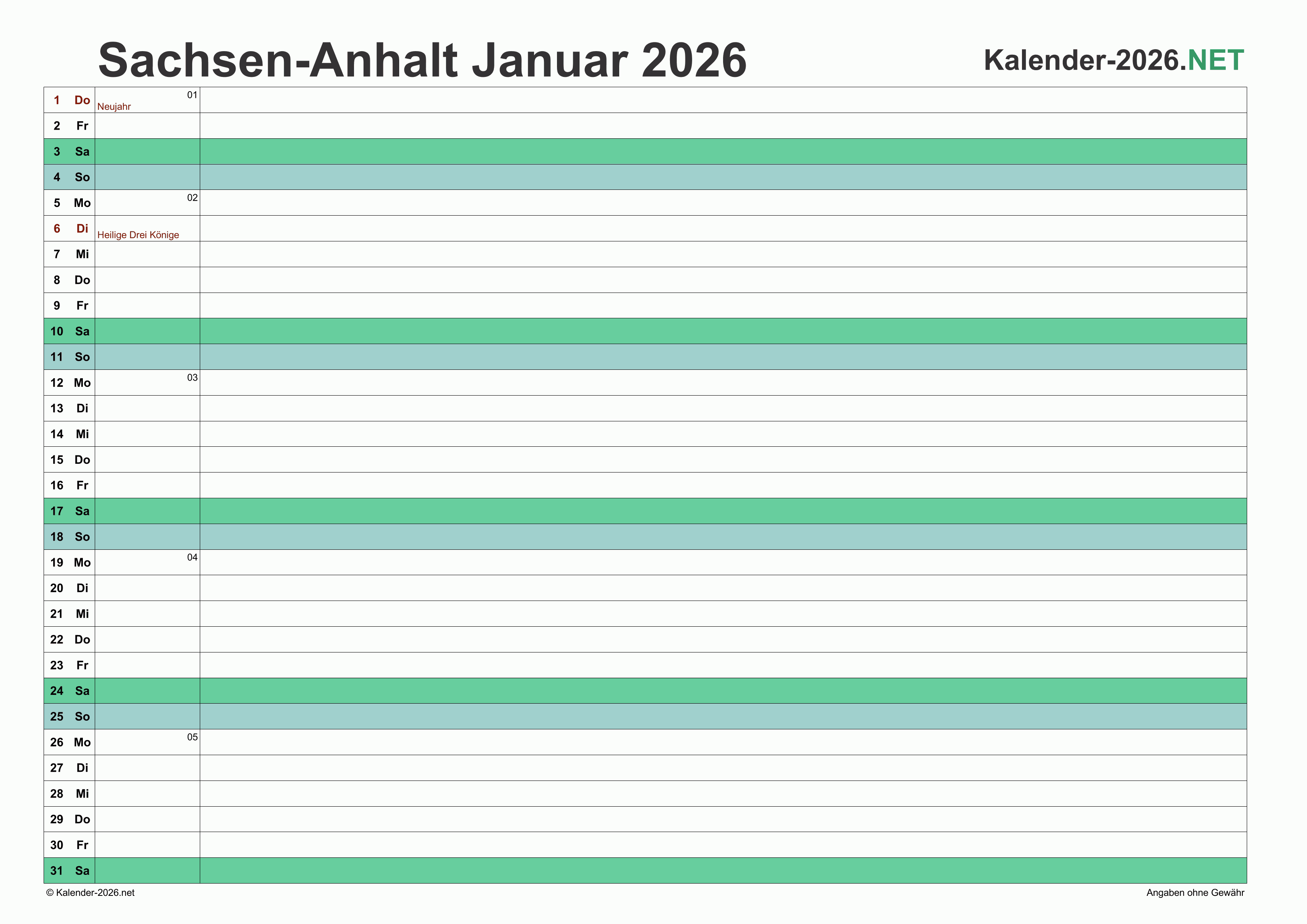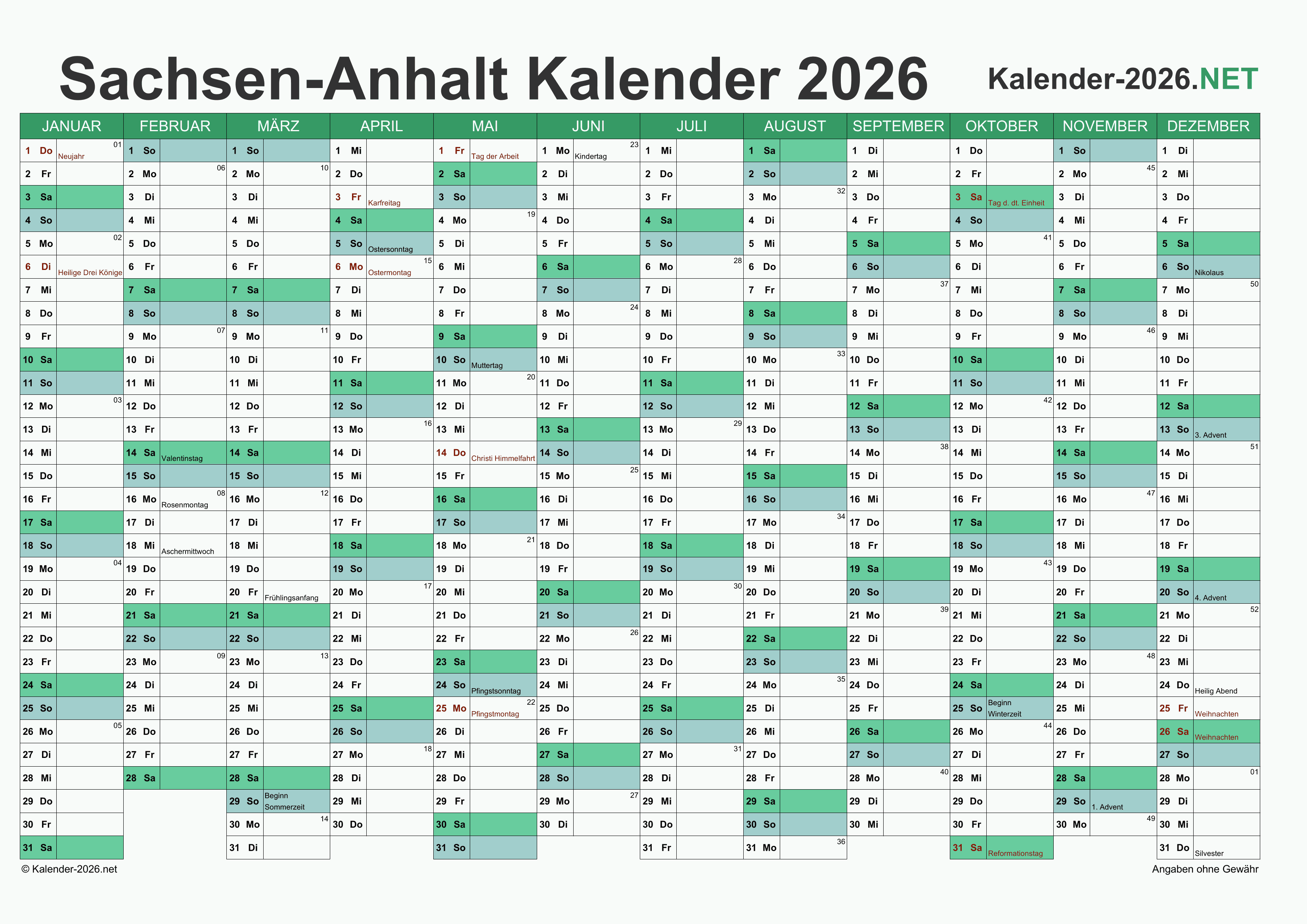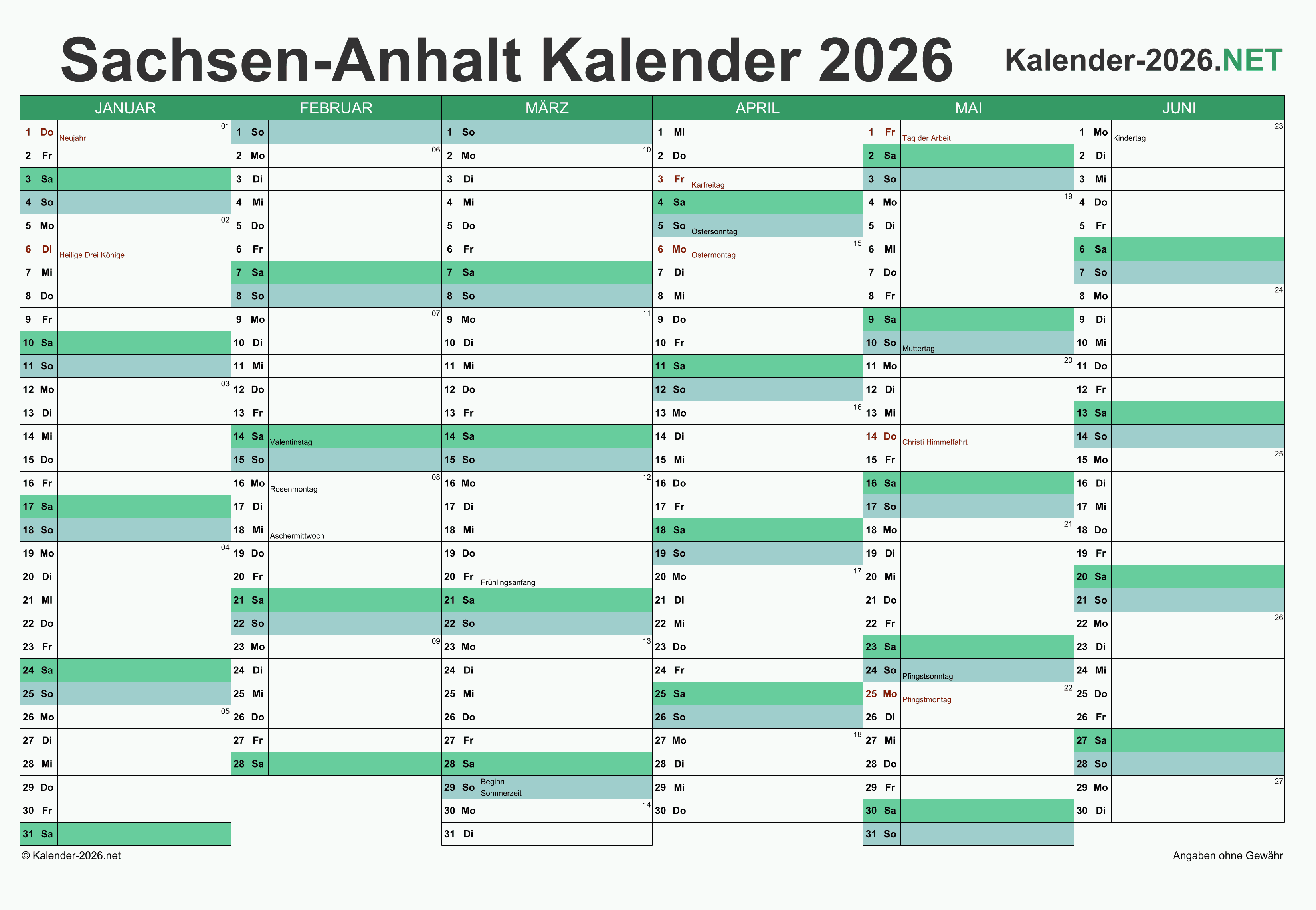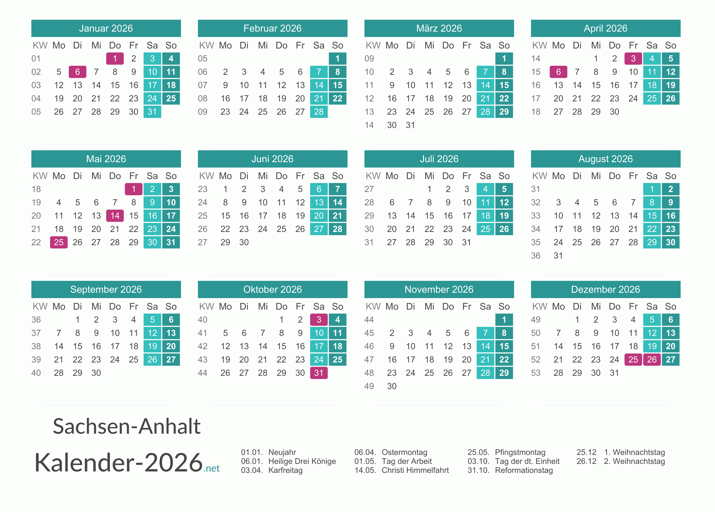 Hier finden Sie kostenlose Kalender 2026 für Sachsen-Anhalt mit gesetzlichen Feiertagen und Kalenderwochen. Diese Kalendervorlagen im DIN A4-Querformat können ideal als Jahres- und Terminplaner, Notizkalender, Bürokalender, Arbeitskalender, Urlaubsplaner oder Familienkalender verwendet werden.