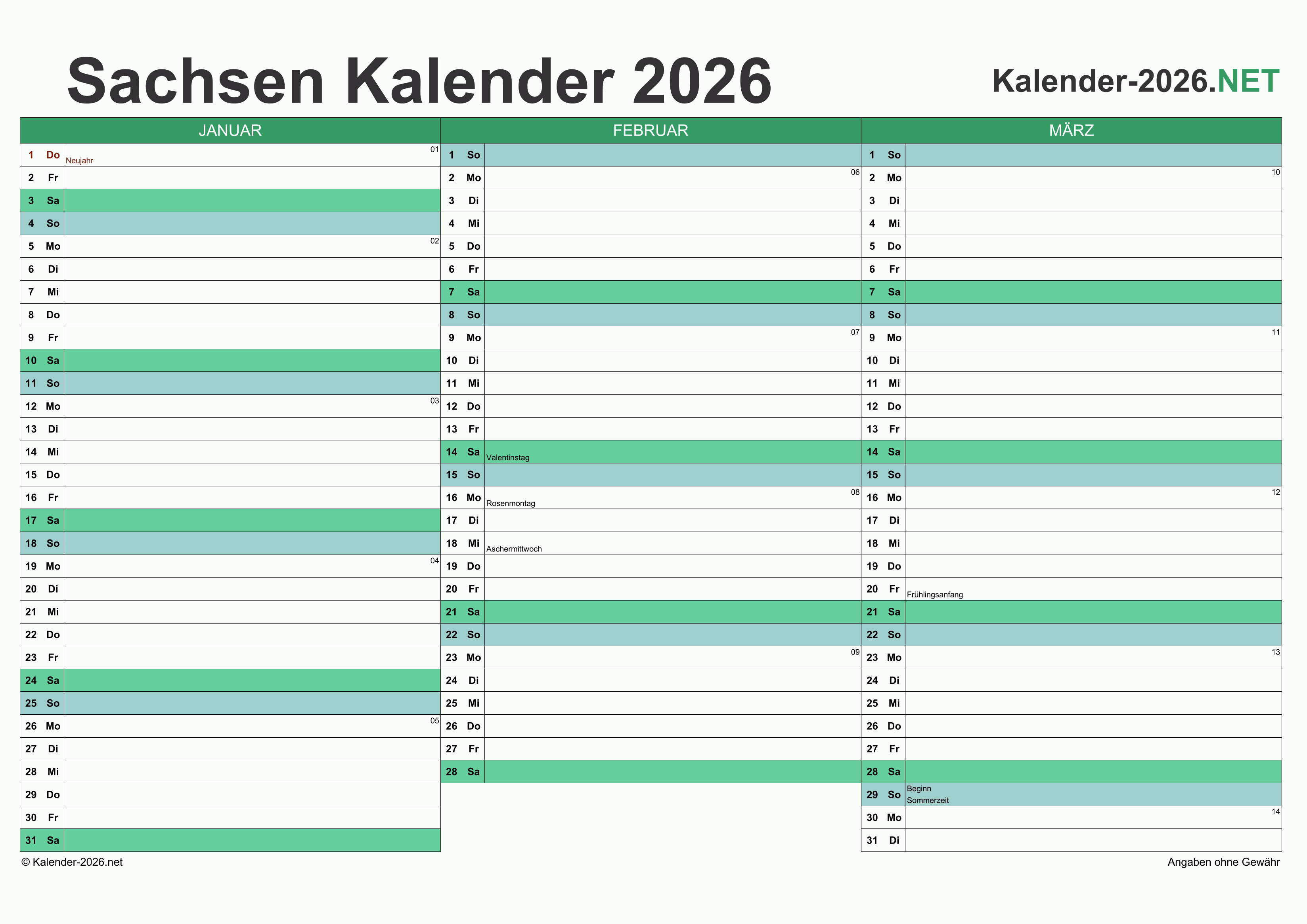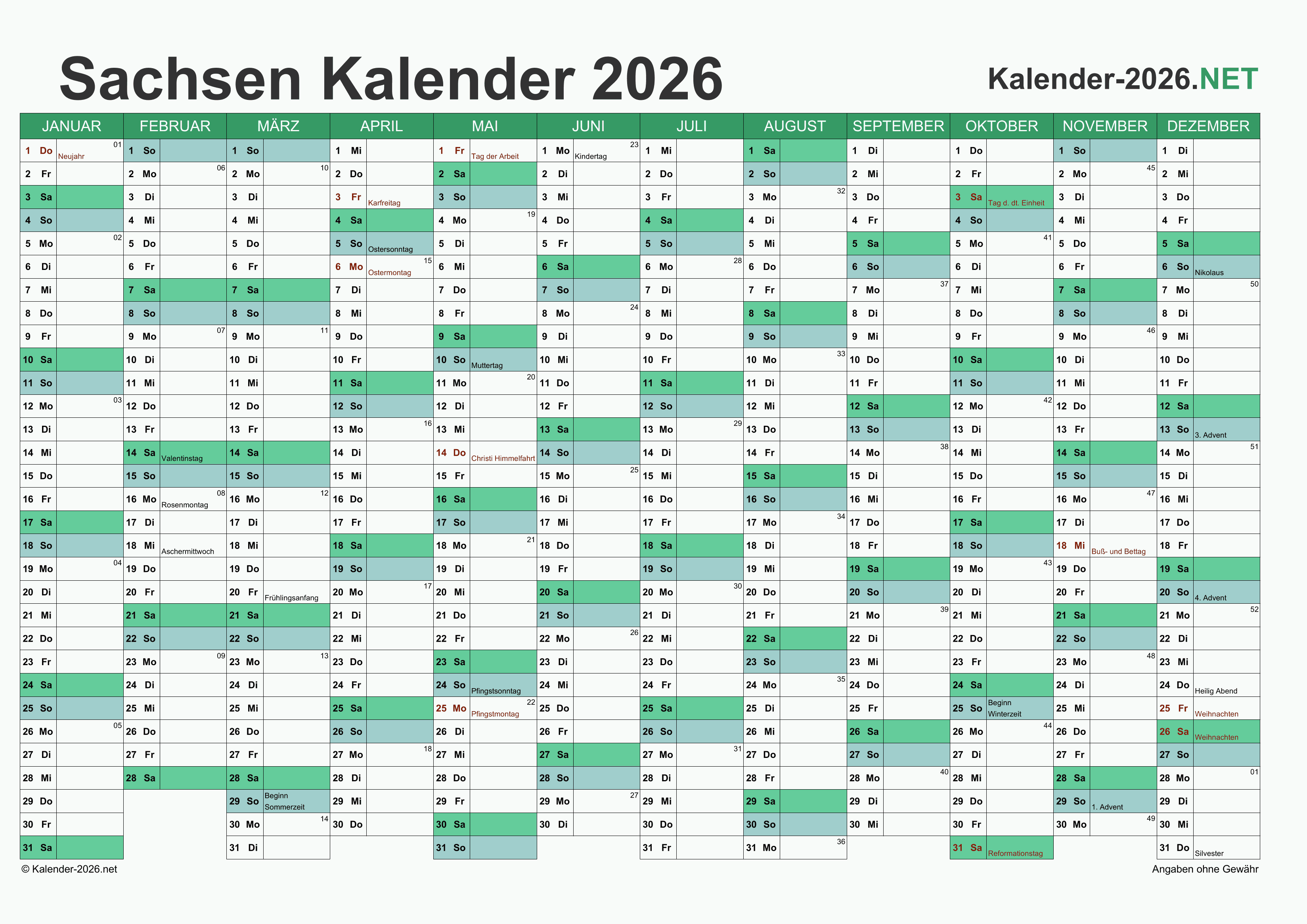 Hier finden Sie kostenlose Kalender 2026 für Sachsen mit gesetzlichen Feiertagen und Kalenderwochen. Diese Kalendervorlagen im DIN A4-Querformat können ideal als Jahres- und Terminplaner, Notizkalender, Bürokalender, Arbeitskalender, Urlaubsplaner oder Familienkalender verwendet werden.
